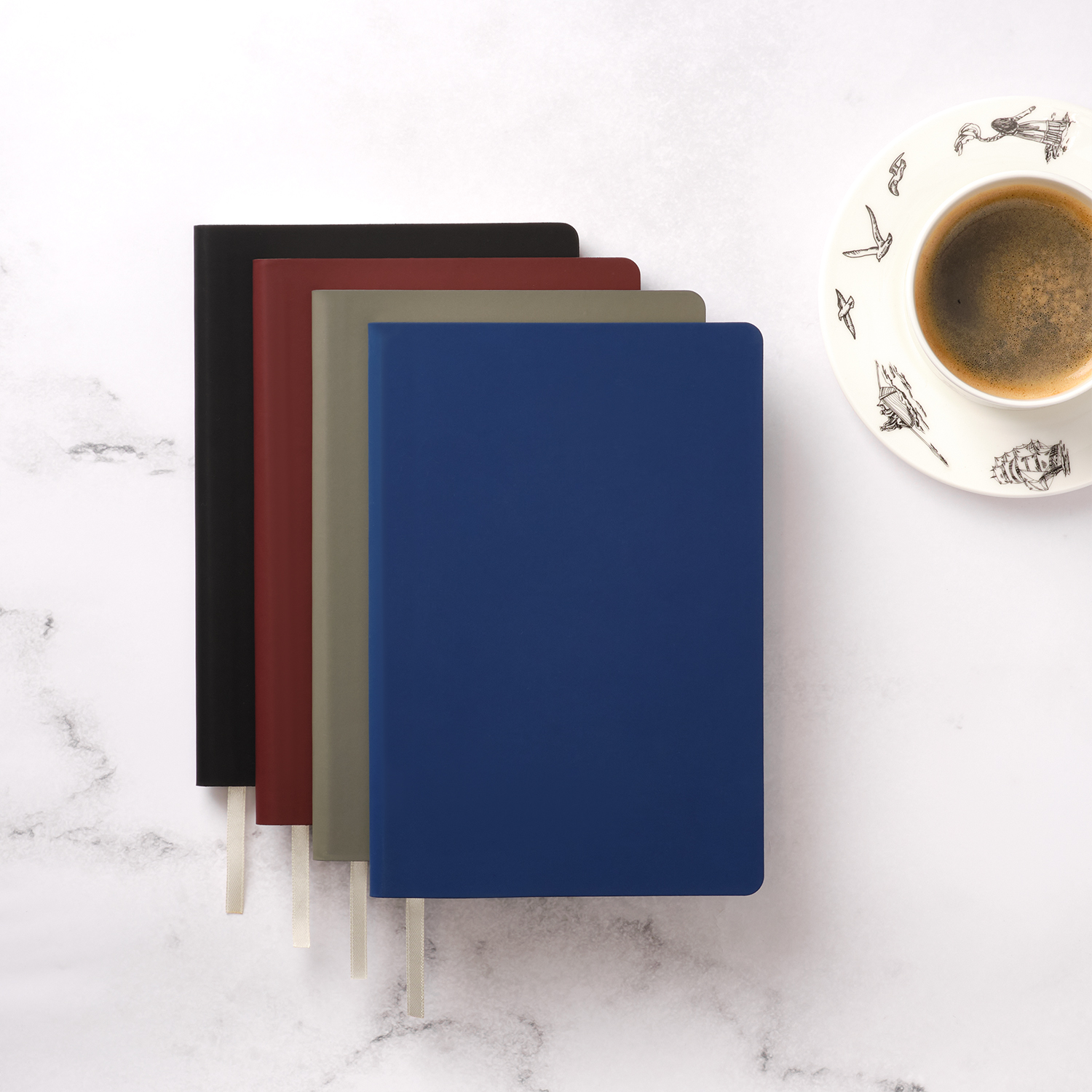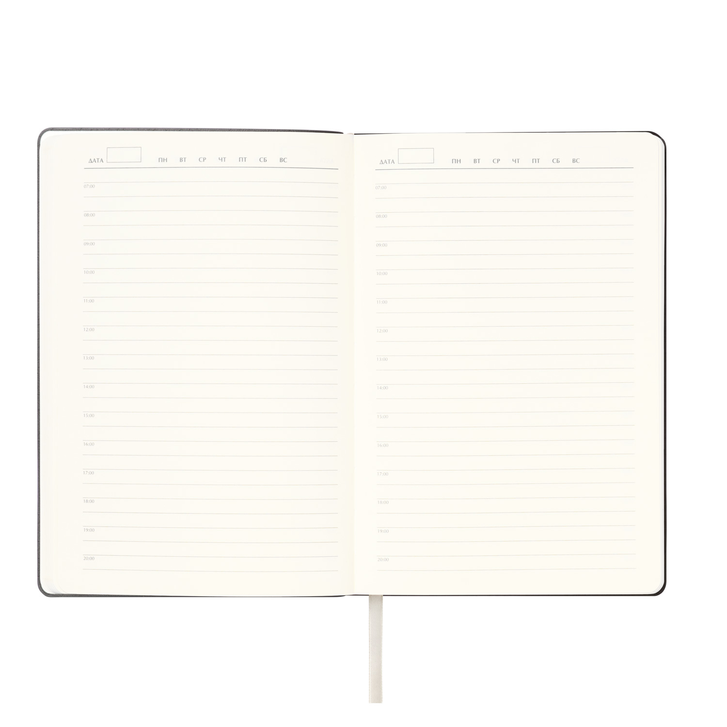 Недатированный ежедневник в гибкой обложке из качественной искусственной кожи со скругленными уголками. Покрытие с эффектом Soft Touch, гладкое, матовое, слегка припудренное, не блестит. Очень приятное на ощупь. Форзац,нахзац и срез кремового цвета. Страницы со скругленными уголками из гладкого шелковистого офсета, кремовые. Одинарное атласное ляссе 6 мм.