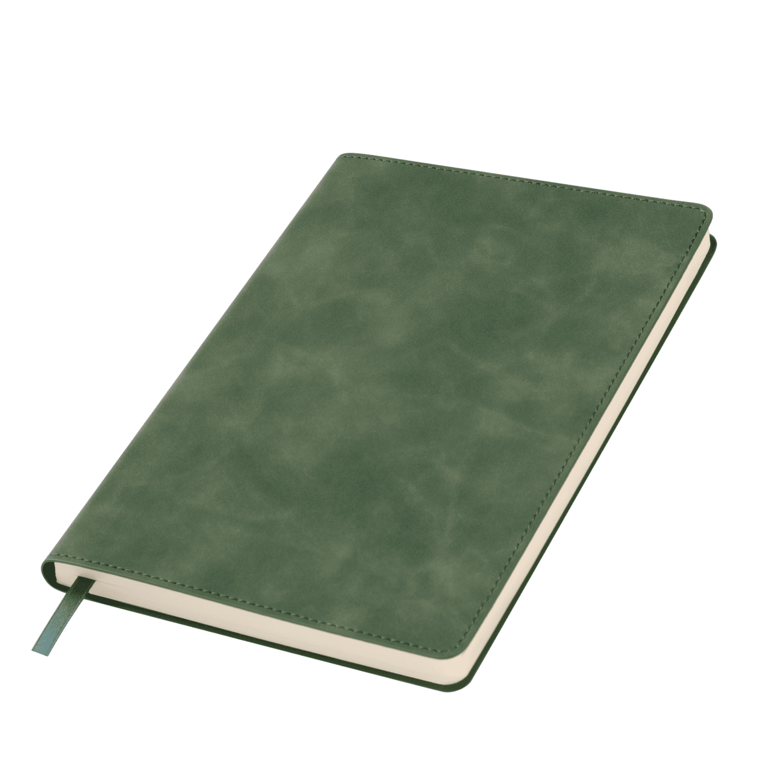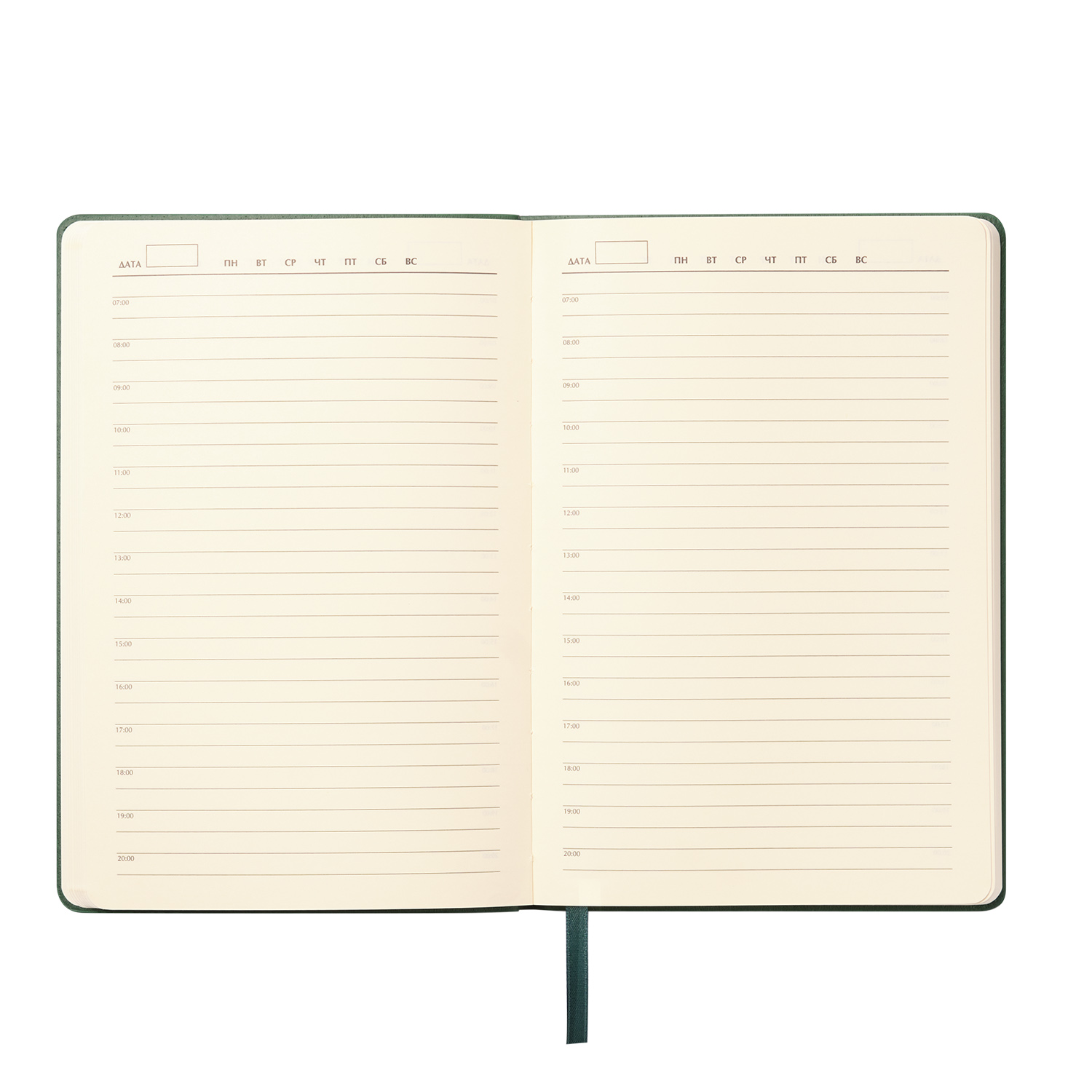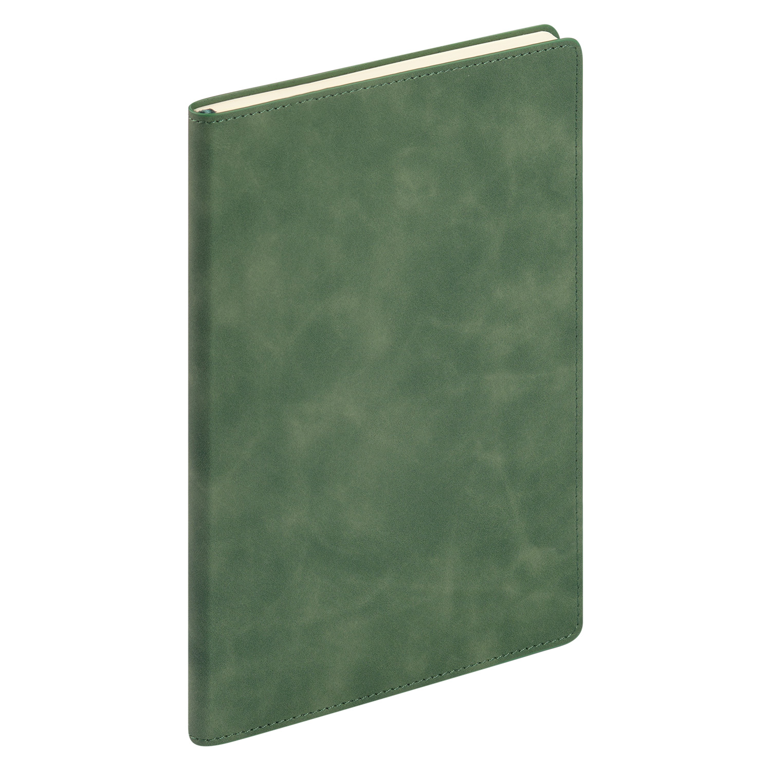 Недатированный ежедневник в гибкой обложке из качественной искусственной кожи со скругленными уголками. Обложка выполнена из мягкого шелковистого материала, по тактильности напоминающего замшу. Прошивка по периметру в тон материала обложки. Форзац,нахзац и срез кремового цвета. Страницы со скругленными уголками из гладкого шелковистого офсета, кремовые. Одинарное атласноеляссе 6 мм.