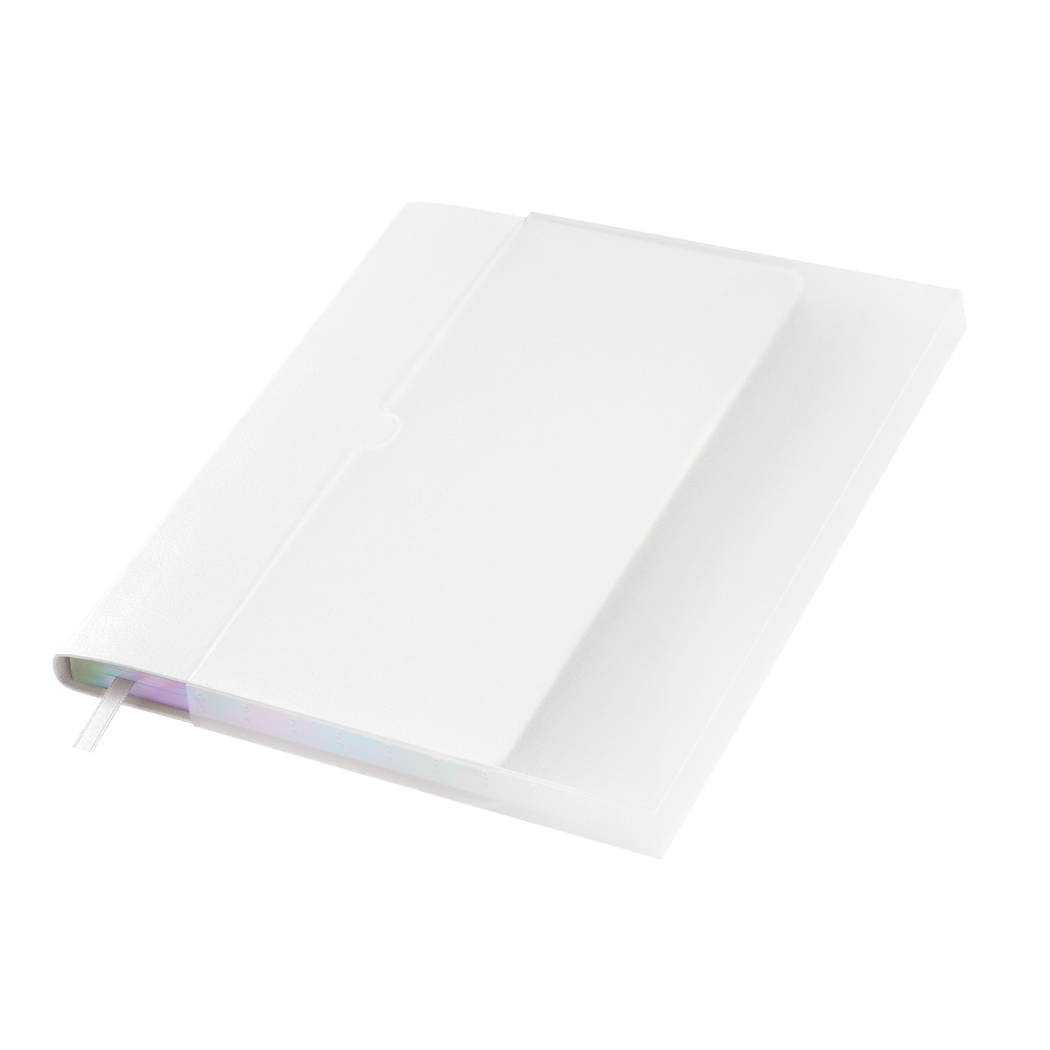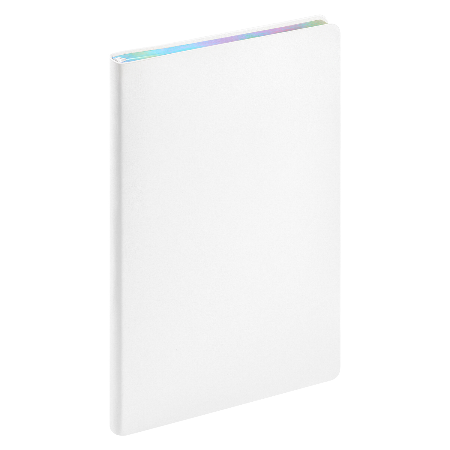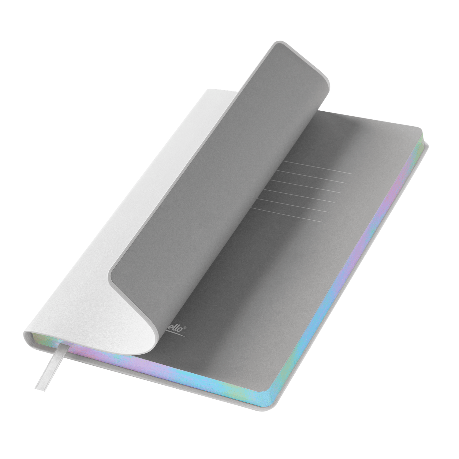 Недатированный ежедневник в гибкой обложке из качественной искусственной кожи. Материал обложки гладкий, текстурированный, с полуглянцевым блеском. Скругленные углы обложки и внутреннего блока. Отличительная особенность коллекции — голографический фольгированный срез блока. Форзац/нахзац– серые. Одинарное атласное ляссе 6 мм.