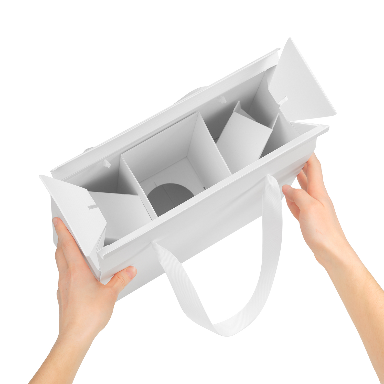 Универсальный пакет – коробка выполнен в белом цвете с ручками из рапсовой ленты. Вместительный и изящный, он станет хорошим решением упаковки подарка. Ложемент удерживает бокалы или другие товары и предохраняет от повреждений. Подходит для упаковки бутылки вина или шампанского.