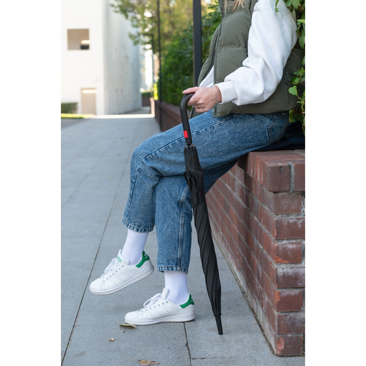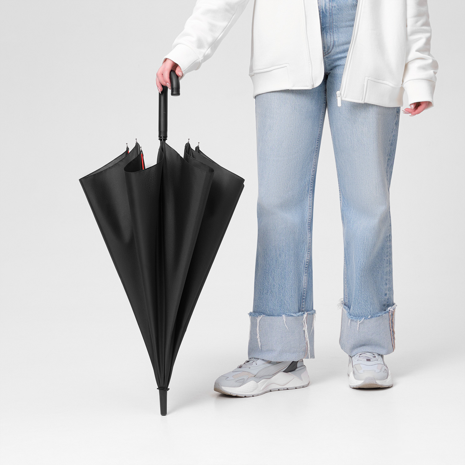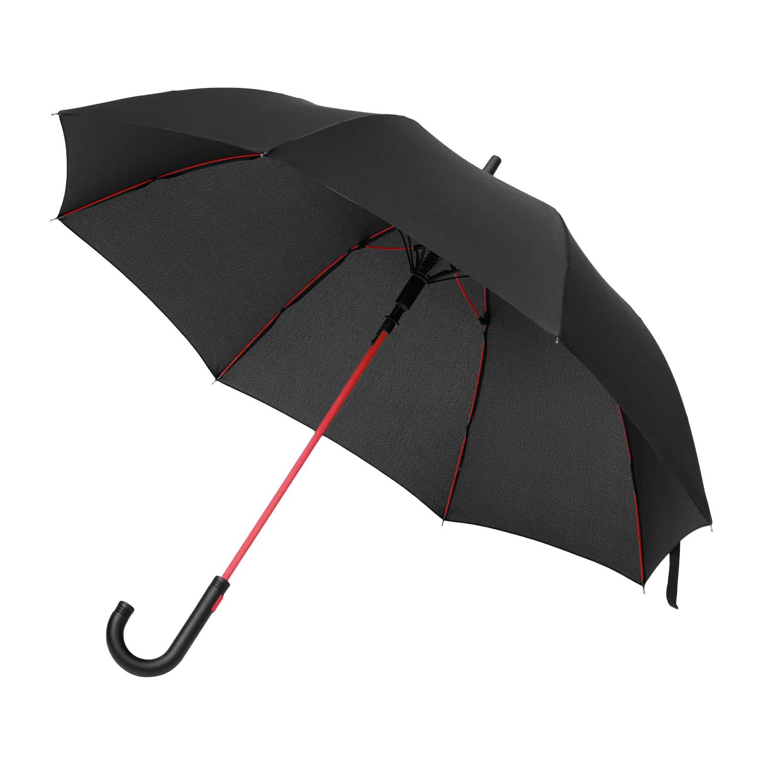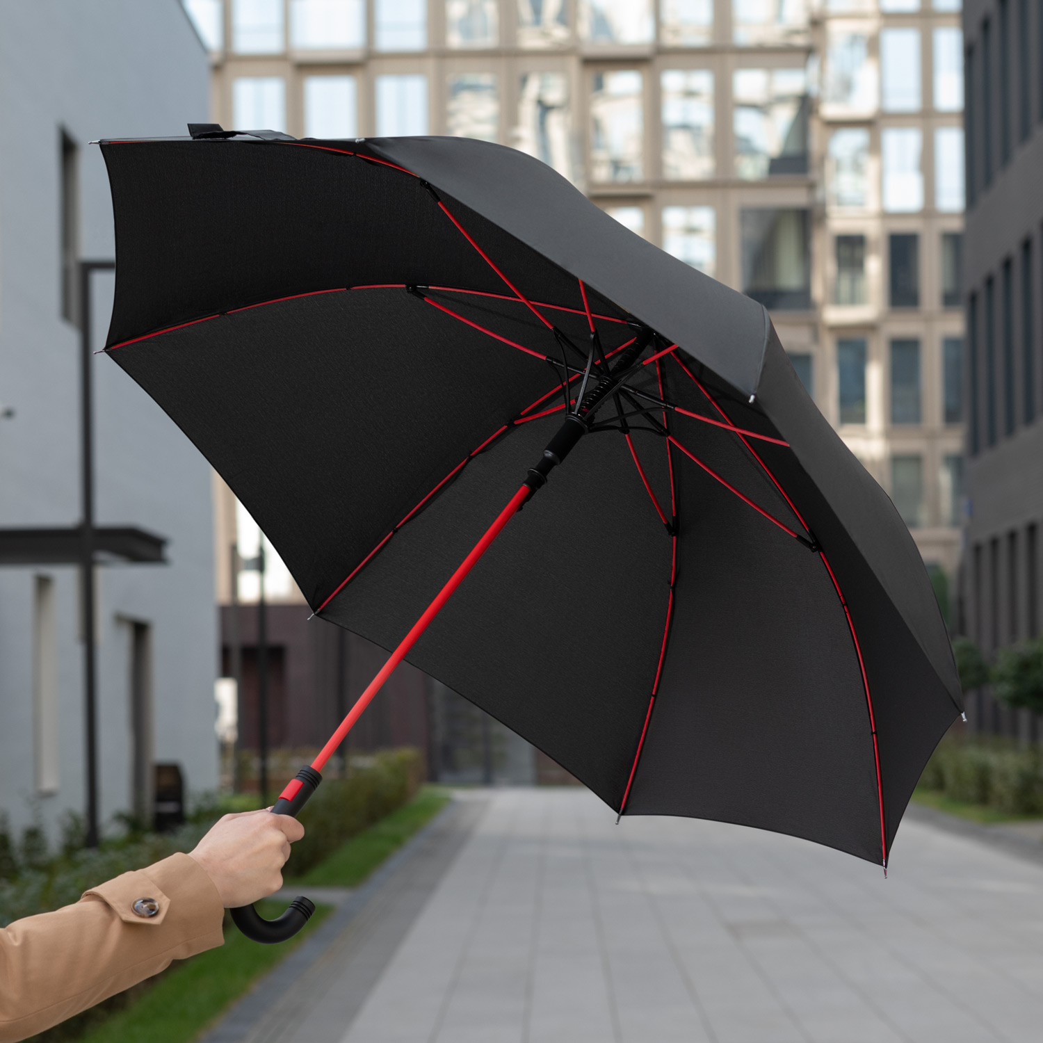 Полуавтоматический зонт быстро раскрывается при нажатии на кнопку. Контрастные цветные спицы окрашены в тон трости и кнопки на ручке. Зонт оснащен гибкими спицами с конструкцией антиветер, которая защищает зонт от поломок при резких порывах ветра.