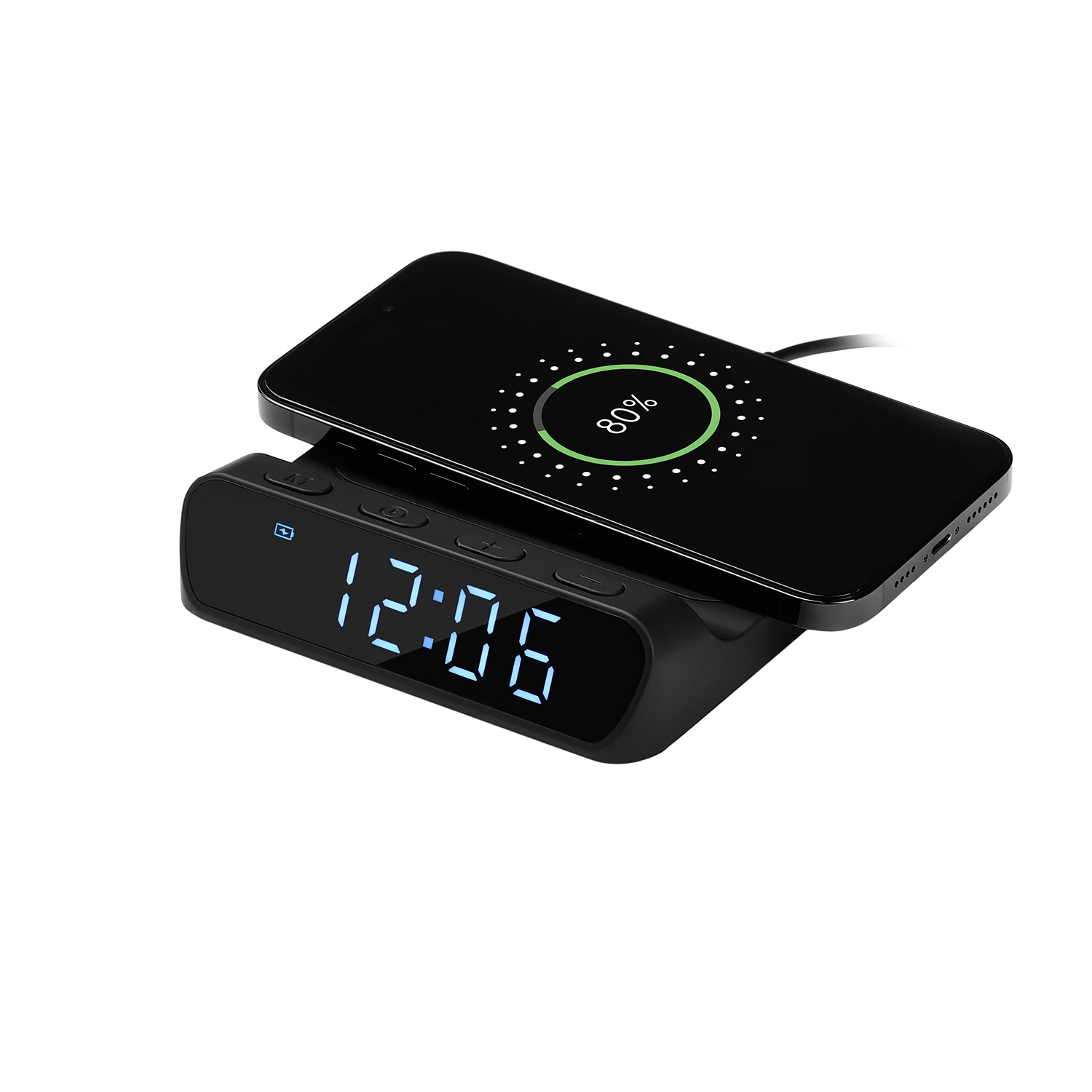 Зарядная станция 15W с часами и будильником. 12- или 24- формат времени. Три уровня яркости дисплея, индикаторы уровня заряда и будильника. Функция энергосбережения - после отключения питания внутренняя батарейка-«таблетка» сохраняет настройки часов, и после повторного подключения к питанию часы не нужно переустанавливать.