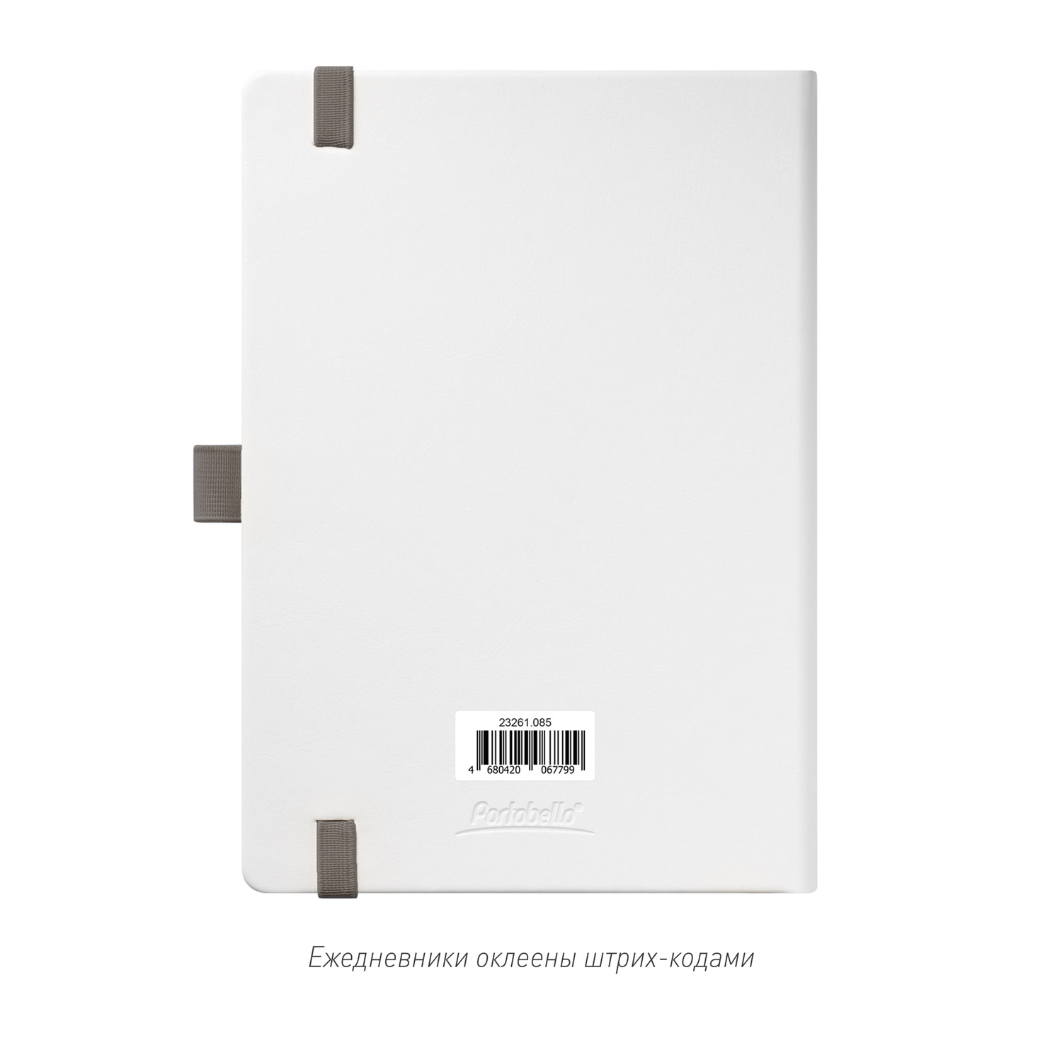 Недатированный ежедневник выполнен в жесткой обложке из искусственной кожи со скругленными уголками. Переплетный материал гладкий, с легкой естественной паутинкой морщин, имеет полуглянцевый блеск. Цвет – чистый белый. Темно-серые матовые форзац и нахзац, а также темно-серый срез блока создают оригинальный динамичный цветовой ансамбль и подчеркивают белизну обложки. Страницы светло-кремового цвета, из гладкого офсета, слегка шелковистые, со скругленными уголками. Добавляют изделию мягкую комфортную теплоту. Двойное атласное ляссе составлено из серой и белой лент. Каждая шириной 6 мм, имеет легкий блеск. Вертикальная фиксирующая резинка прочная, надежная и удобная, в тон срезу. Есть петелька для ручки в тон резинки. Карман на заднем форзаце.