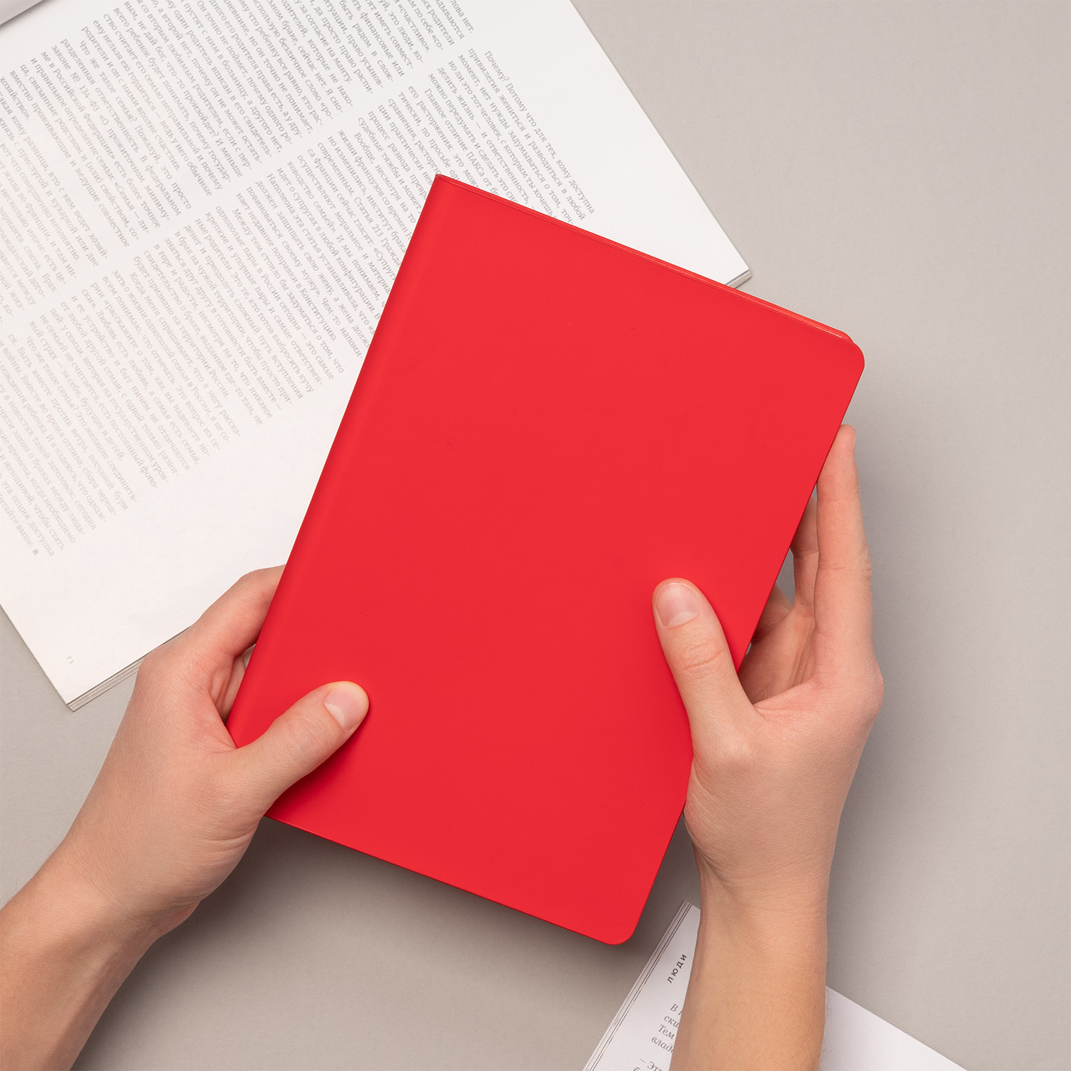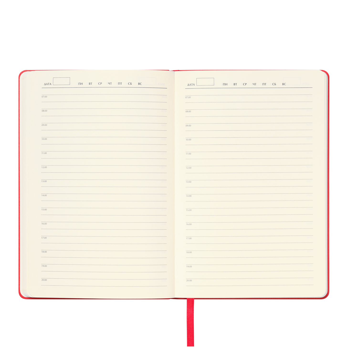Недатированный ежедневник в гибкой обложке из качественной искусственной кожи со скругленными уголками. Покрытие с эффектом Soft Touch, гладкое, матовое, слегка припудренное, не блестит. Очень приятное на ощупь. Форзац,нахзац и срез кремового цвета. Страницы со скругленными уголками из гладкого шелковистого офсета, кремовые. Одинарное атласноеляссе 6 мм.