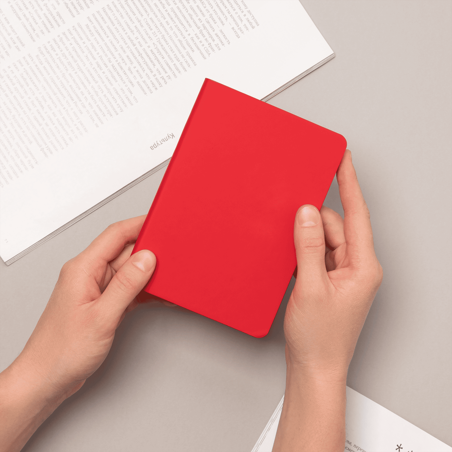 Недатированный ежедневник в формате А6. Гибкая обложка из качественной искусственной кожи со скругленными уголками. Покрытие с эффектом Soft Touch, гладкое, матовое, слегка припудренное, не блестит. Очень приятное на ощупь. Форзац,нахзац и срез кремового цвета. Страницы со скругленными уголками из гладкого шелковистого офсета, кремовые. Одинарное атласное ляссе 6 мм в цвет обложки.