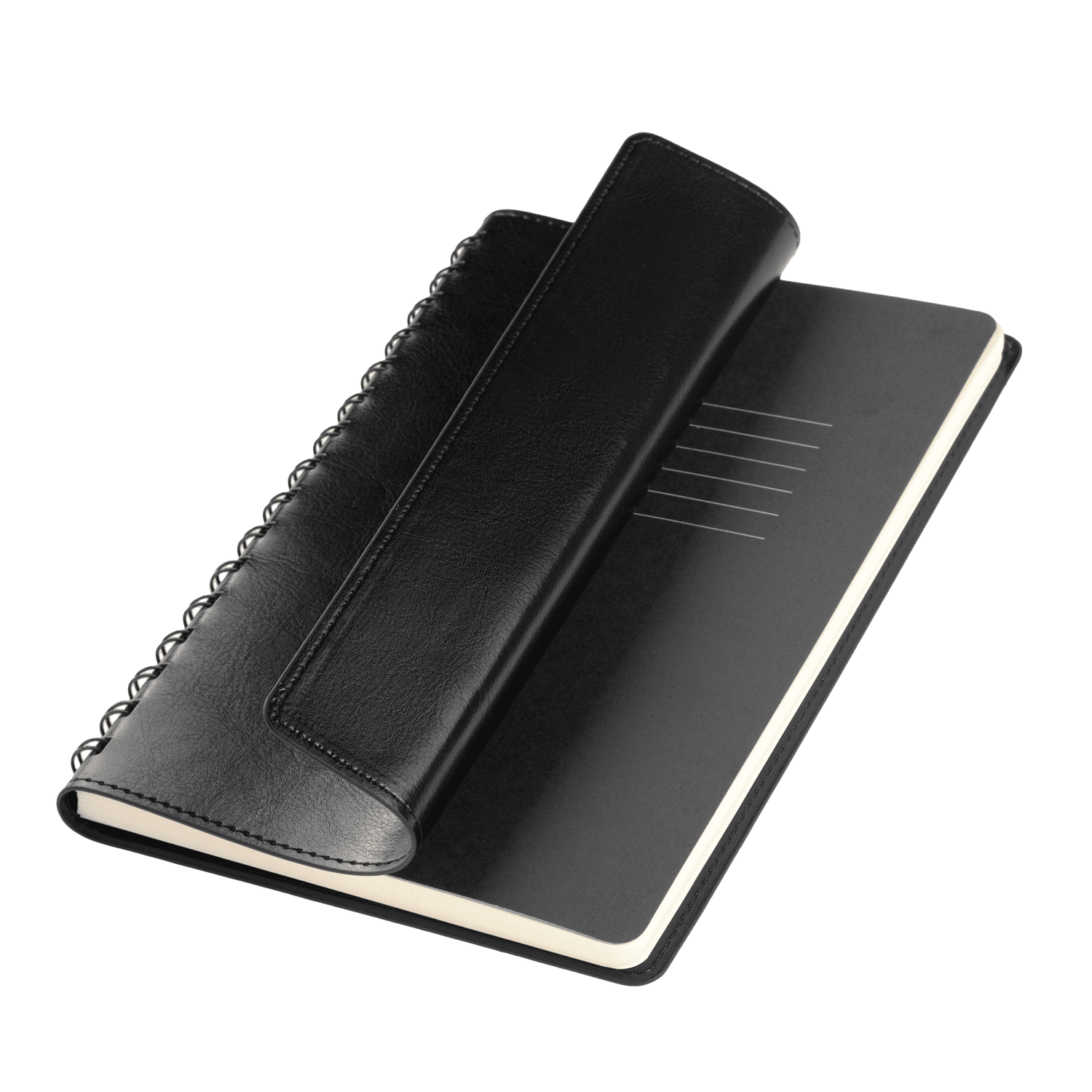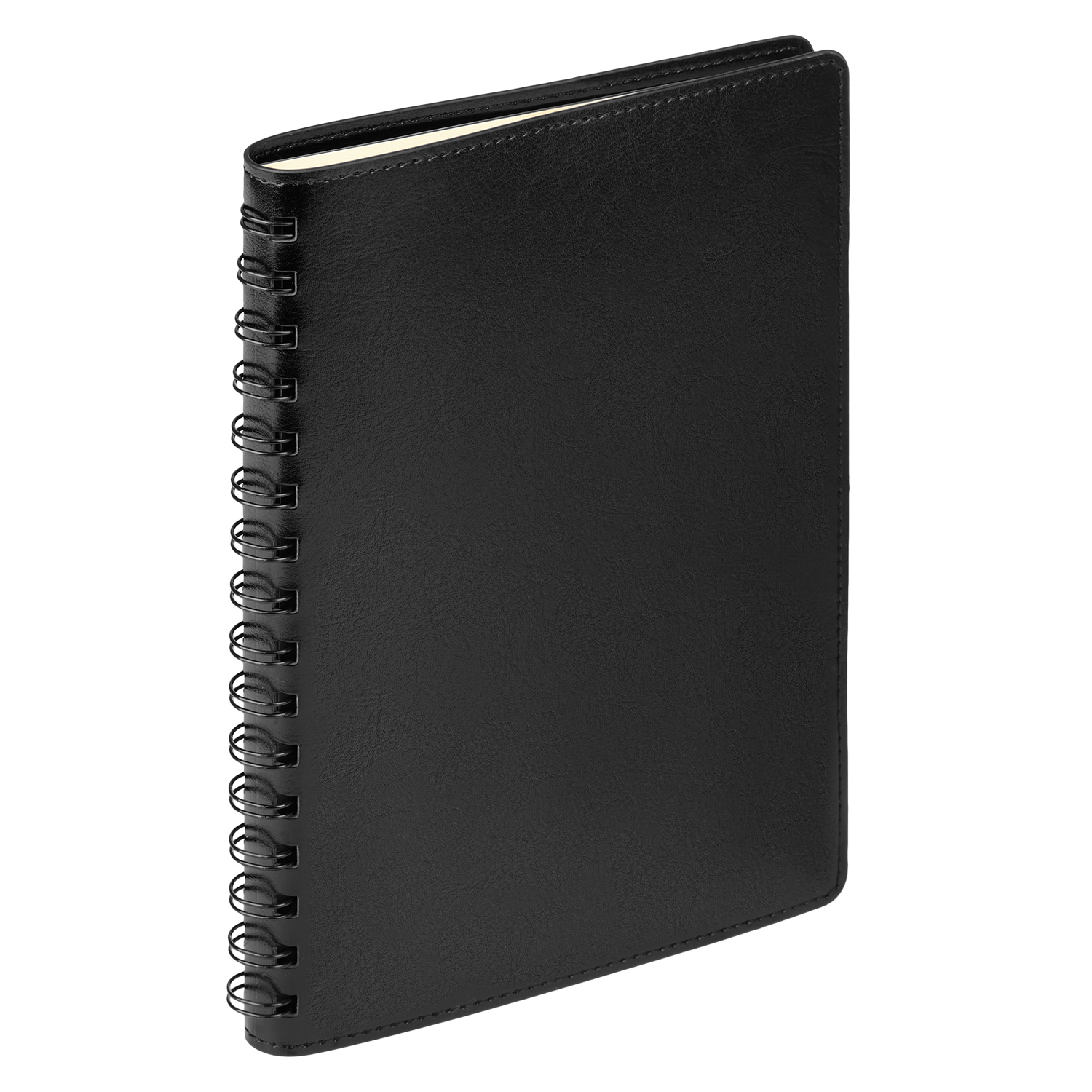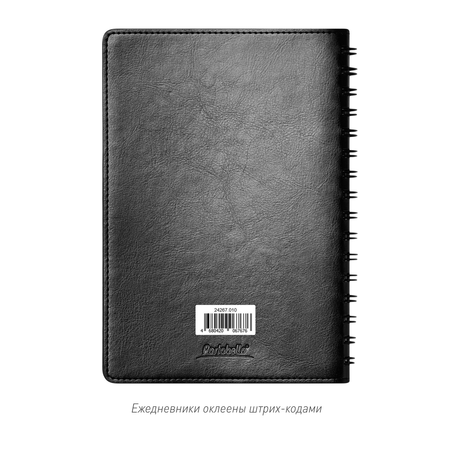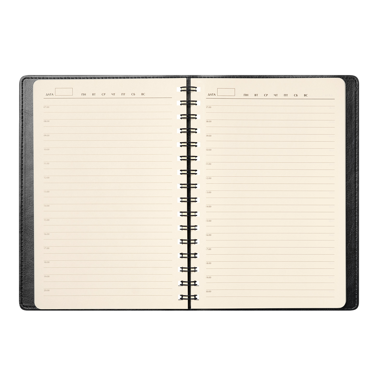 Недатированный ежедневник на пружине в гибкой обложке из качественной искусственной кожи. Обложка выполнена из сшивки двух материалов. Материал обложки гладкий, текстурированный, с полуглянцевым блеском. По периметру обложки выполнена прошивка в тон. Скругленные углы обложки и внутреннего блока. Ежедневник надежно скреплен полускрытой пружиной в цвет обложки. Страницы блока и срез кремовые. Форзац/нахзац - в цвет обложки.