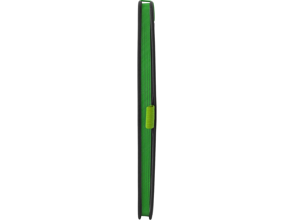 Блокнот в твердой обложке с закругленными углами черного цвета. Ляссе, резинка и срез яркого контрастного цвета делают его очень стильным и функциональным бизнес-аксессуаром.