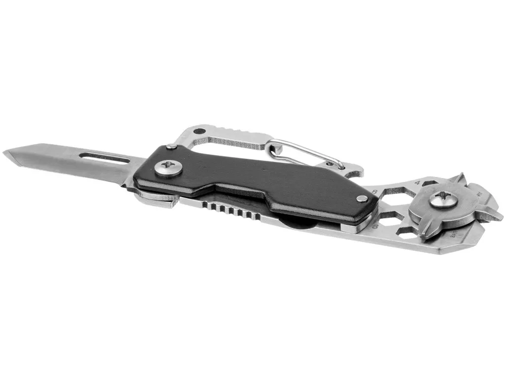 Многофункциональный инструмент Teron. Легкий многофункциональный инструмент с ножиком, карабином, линейкой, открывалкой, 4-мя шестигранными ключами, спицевым ключом, гвоздодером, 1 плоской отверткой, 1 маленькой и 1 большой отвертками Philips. Упакован в подарочную коробку Elevate. Алюминий.