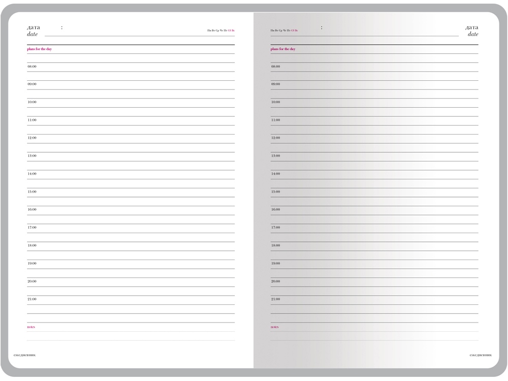 В ежедневнике Sidney Nebraska есть полезная справочная информация и телефонная книга на 18 листов, а также 272 страницы для записи идей, мыслей и составления рабочих планов. Для изготовления страниц используется качественный белый офсет повышенной плотности (70 г/кв м) с серебристым срезом, который производится в Японии и подходит для всех видов чернил. Разметка блока с указанием времени позволяет планировать дела с точностью до 1 часа.