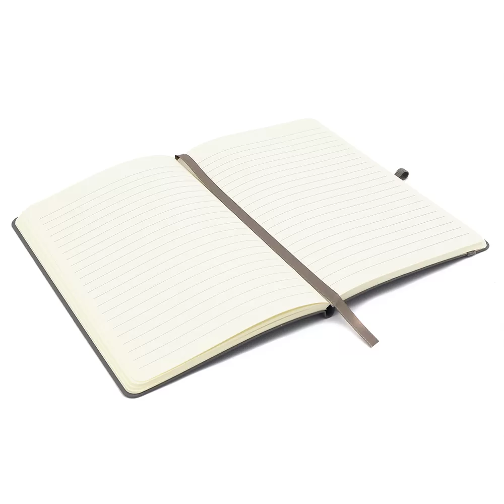 Блокнот формата А5 с мягким покрытием из PU-материала с имитацией рисунка кожи, с эластичной застежкой и текстильной закладкой, наличие петли для ручки в цвет блокнота, 192 страницы, плотность 70г/м, страницы с черными линиями. Цвет по PANTONE® (максимально приближен): Cool Gray 10 C.