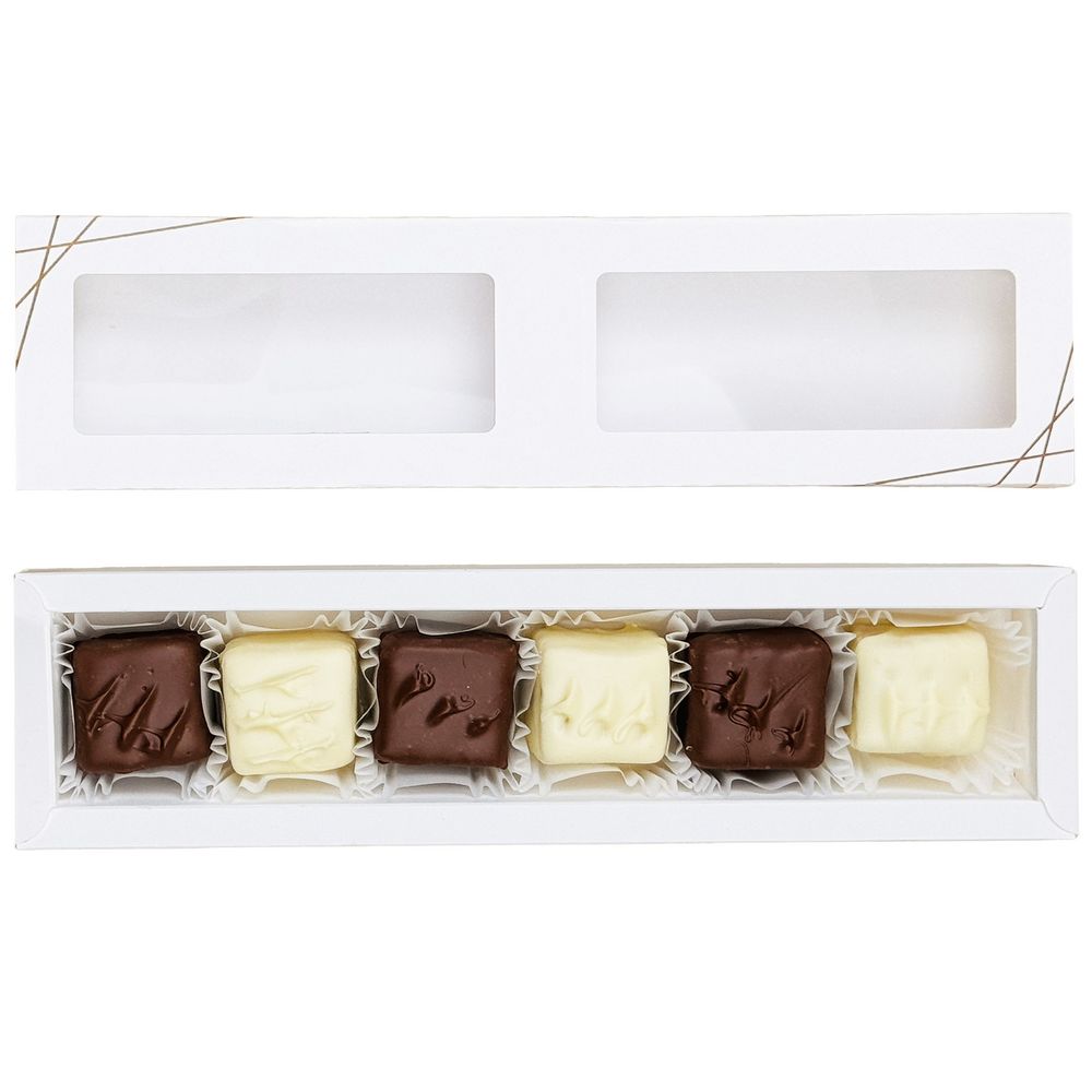 Каждая конфета ручной работы в этом лаконичном наборе — это восторг для истинных гурманов. Нежный марципан в начинке обрамляется молочным или белым шоколадом, создавая обволакивающую мягкую сладость. Молочный шоколад добавляет к нежному вкусу марципана едва уловимую сладость и кремовую глубину, а белый — подчеркивает яркие миндальные нотки.