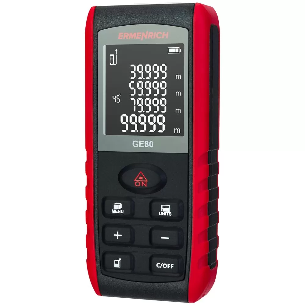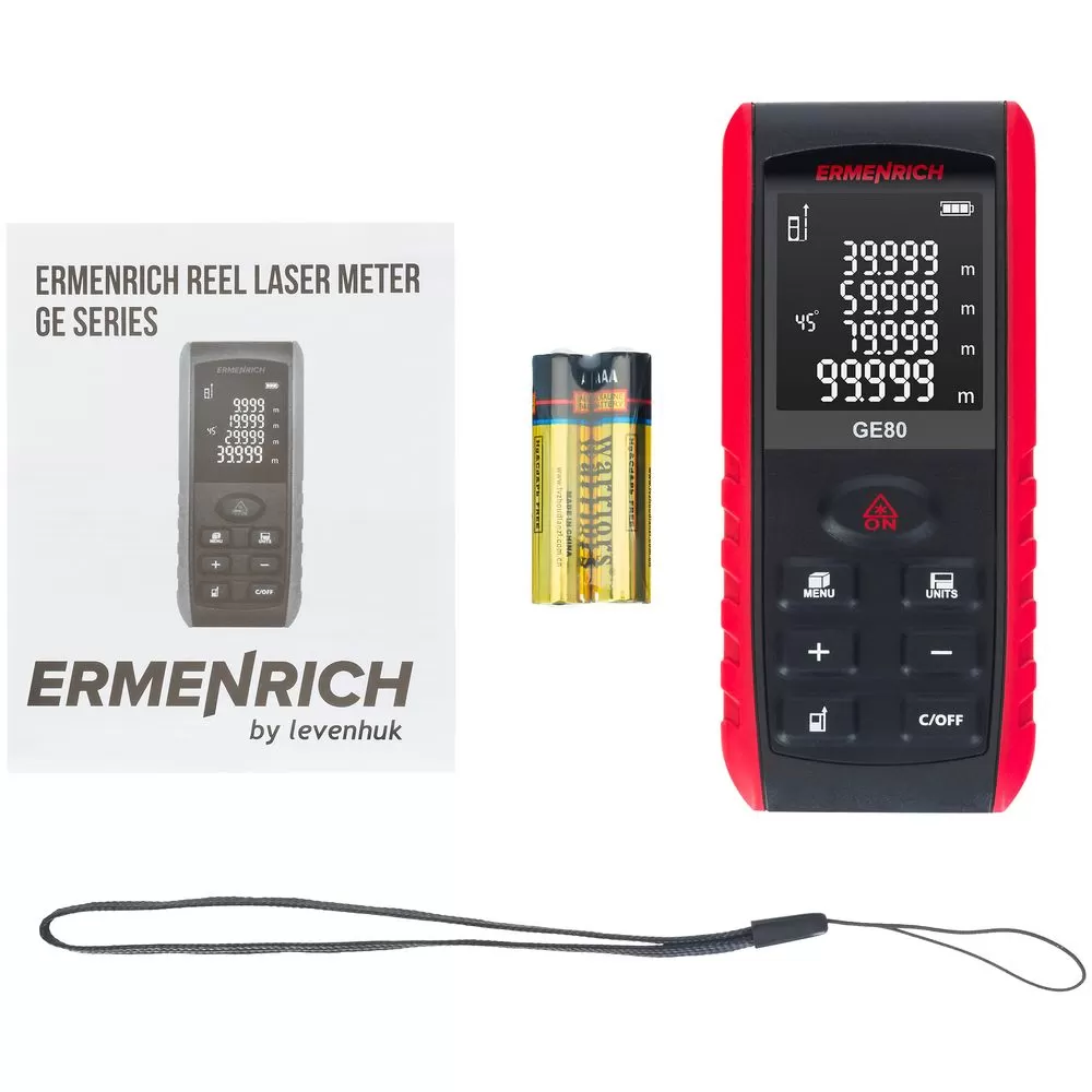 Ermenrich Reel GE80 — лазерная рулетка для самого широкого применения при измерении линейных размеров, площадей и объемов помещений, зданий и сооружений.