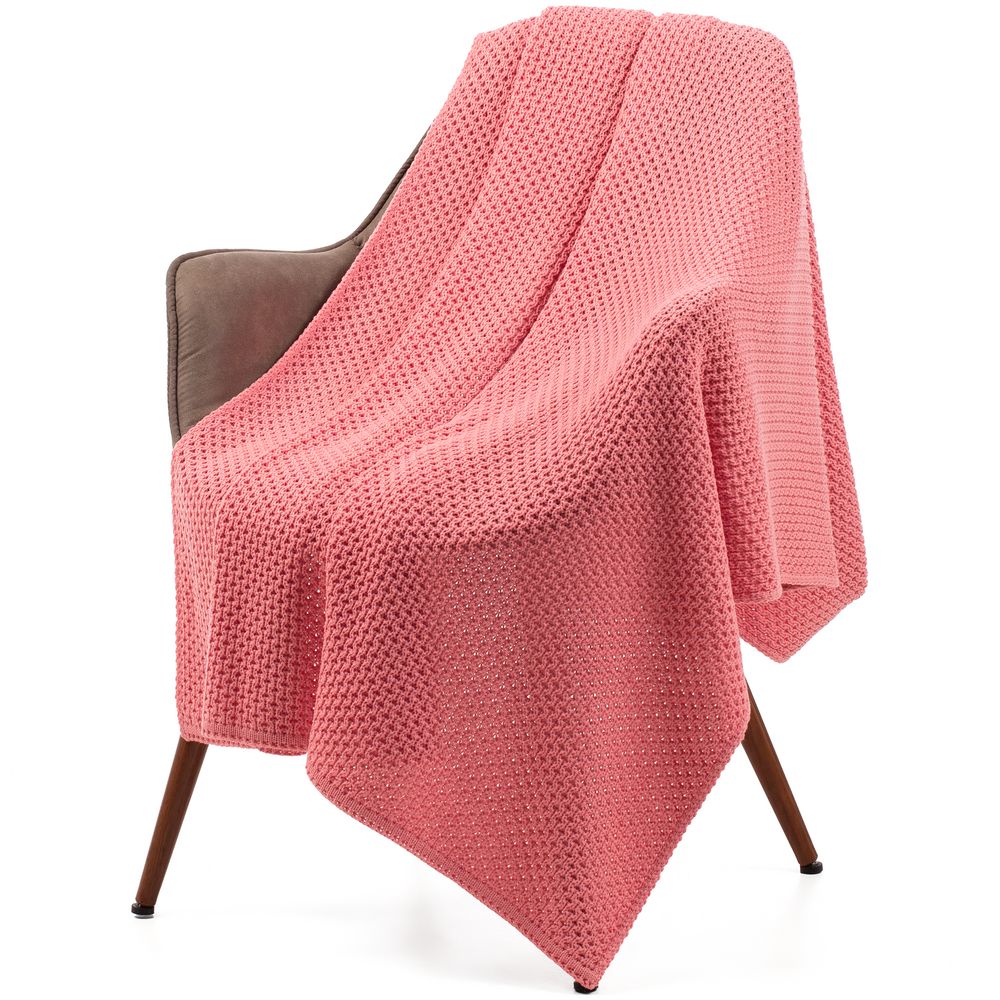 Модель: однотонный плед с фактурной вязкой, которая позволяет сделать его воздушным и объемным. Чередуя различные типы петель на гладком полотне, можно вывязать любую графику — логотип, текст, товарный знак.