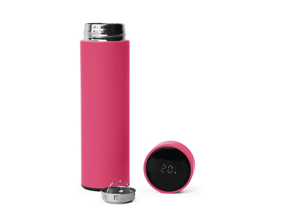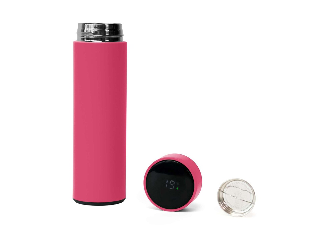 Термос из нержавеющей стали, покрытый цветным soft touch, с крышкой, в которой встроен термометр и LED дисплей, показывающий температуру внутри термоса. Объем: 500 мл. Упаковка: каждый термос в крафт коробке.