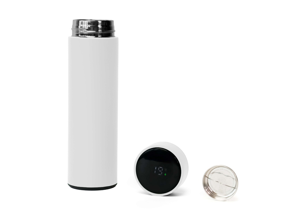 Термос из нержавеющей стали, покрытый цветным soft touch, с крышкой, в которой встроен термометр и LED дисплей, показывающий температуру внутри термоса. Объем: 500 мл. Упаковка: каждый термос в крафт коробке.