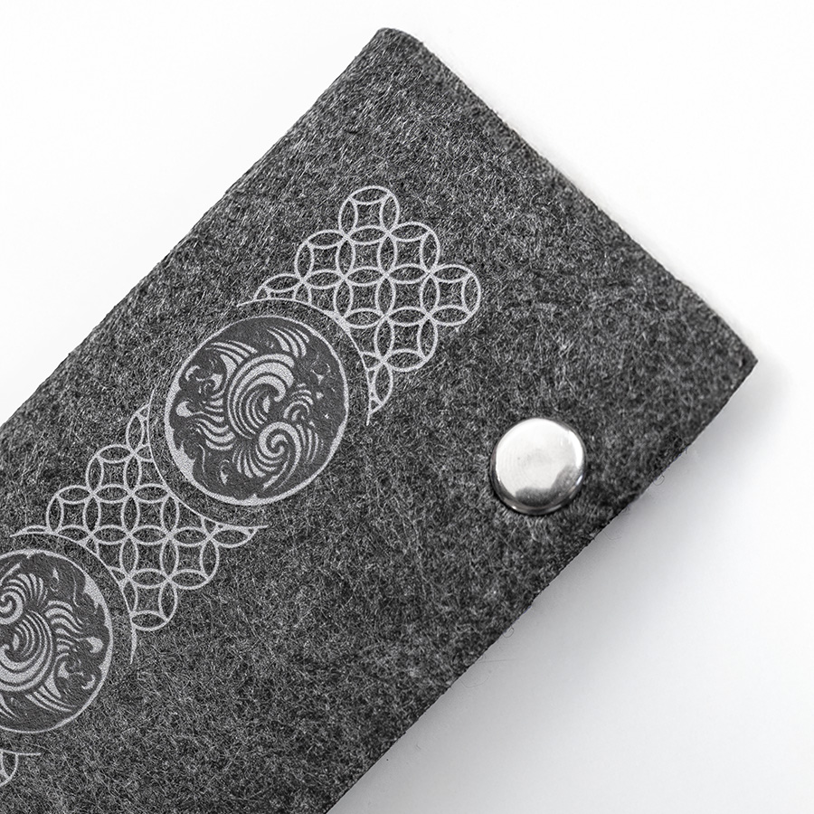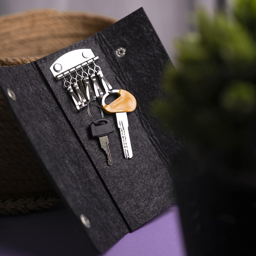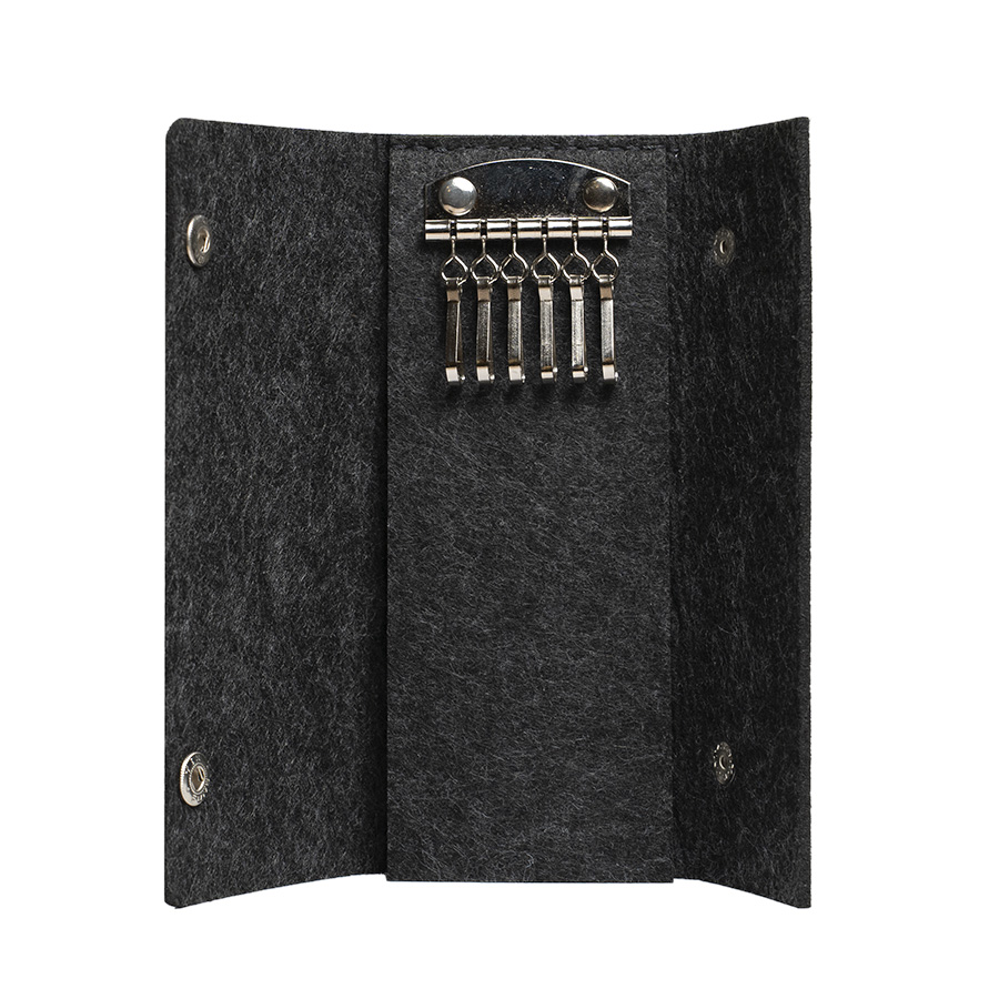 Ключница из RPET фетра на 2х кнопках-застежках. Внутри металлическая вставка на 6 ключей. Цвет темно-серый. Размер 10 х 17,3 см (20,3 х 17,3 в раскрытом виде). Плотность 3 мм. Виды нанесения: обычный трансфет и DTF.