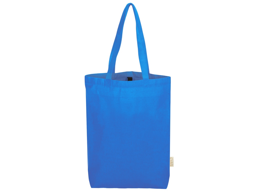 Удобная сумка-шоппер из переработанного хлопка. Можно хранить в сложенном виде и фиксировать с помощью эластичной ленты, застегивающейся на кнопку. Трафаретная печать (1 цвет (цветные изделия)) на данный товар осуществляется бесплатно.