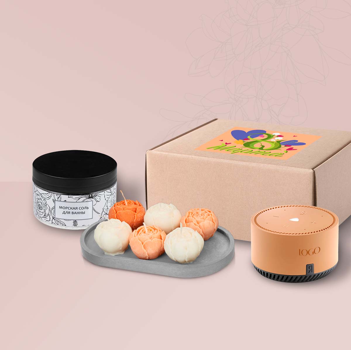 2. Набор свечей на подставке «Пионы», белый, темно-персиковый