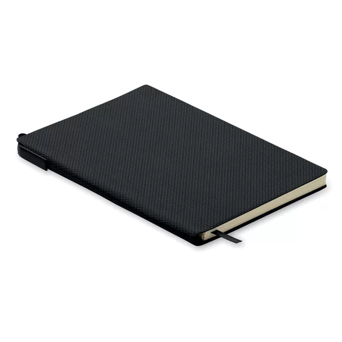 Блокнот формата A5 в обложке из полиуретана в комплекте с пластиковой шариковой ручкой. В переплете. 160 линованных страниц из переработанной бумаги (80 листов).