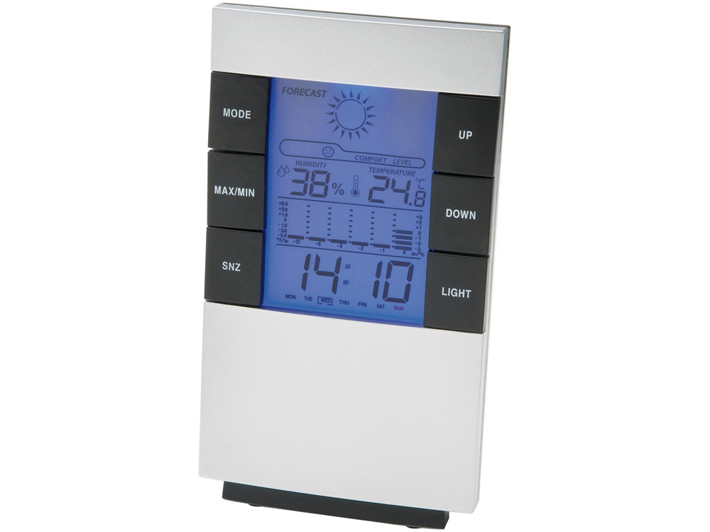 Настольная метеостанция с будильником показывает дату, время, день недели, уровень влажности и температуры в помещении. По желанию можно включить и выключить подсветку. Работает от 2 батареек размера AAA, в комплект не входят. Тампопечать (1 цвет (цветные изделия)) на данный товар осуществляется бесплатно.