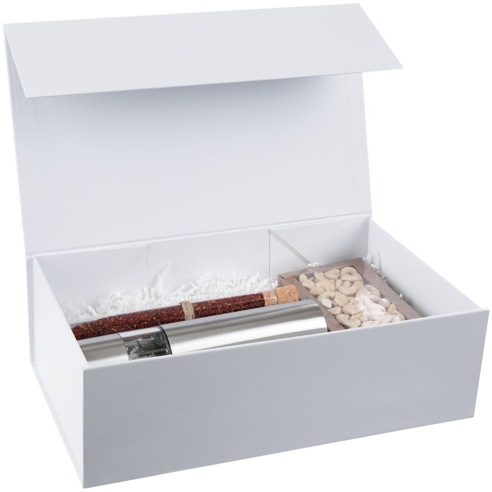 Коробка из переплетного картона, кашированного мелованной бумагой с матовой ламинацией. Крышка на магните.