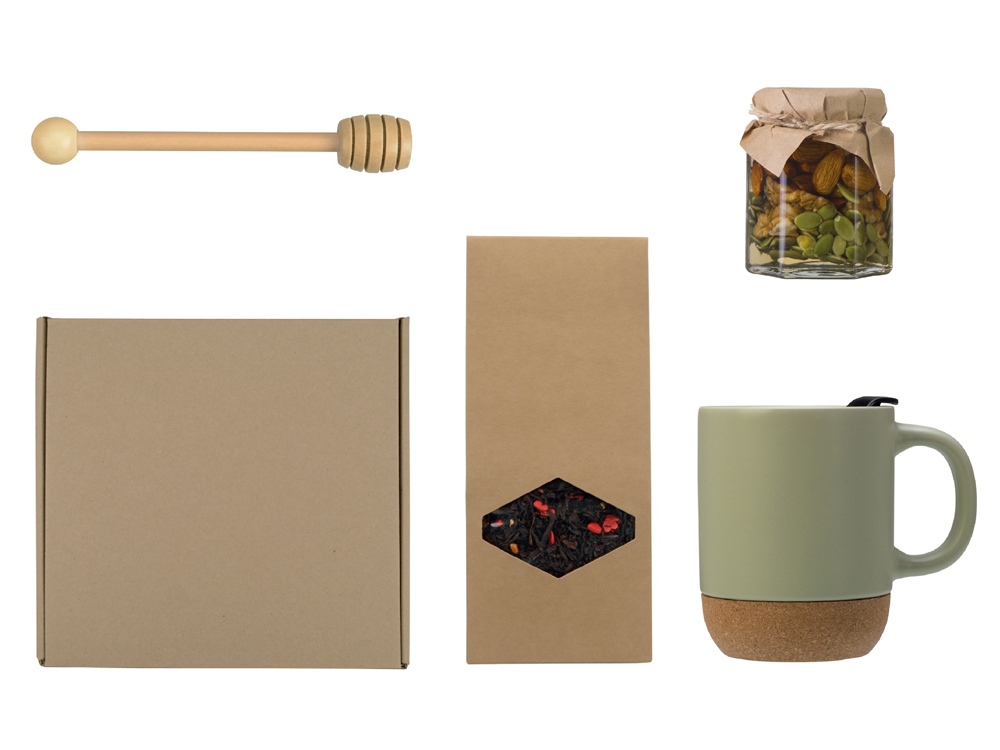 | Материал | кружка - керамика, пробка, мед в банке - стекло, ложка - бамбук, чай - крафт-коробка, коробка - картон |