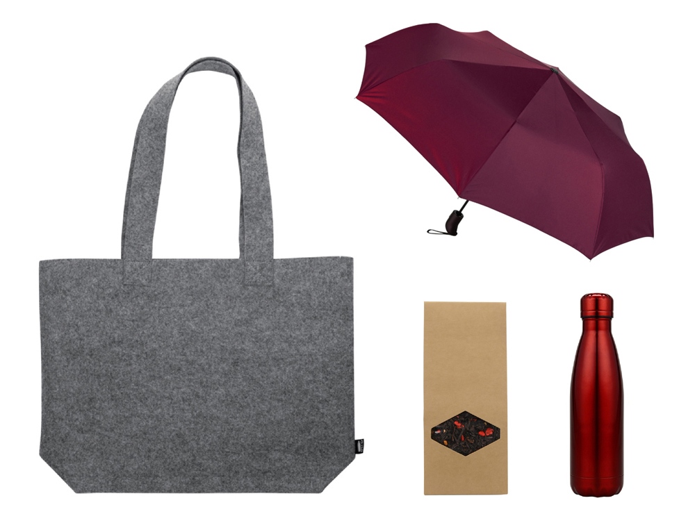 Набор подойдет как для городских прогулок, так и для выездов на природу. Термобутылка сохранит ваш напиток горячим, а зонт защитит от дождя.