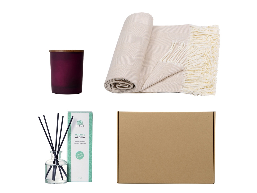 | Материал | плед - 100% хлопок, аромат для дома - стекло, фибровые палочки, свеча - воск, стекло, дерево, коробка - картон |