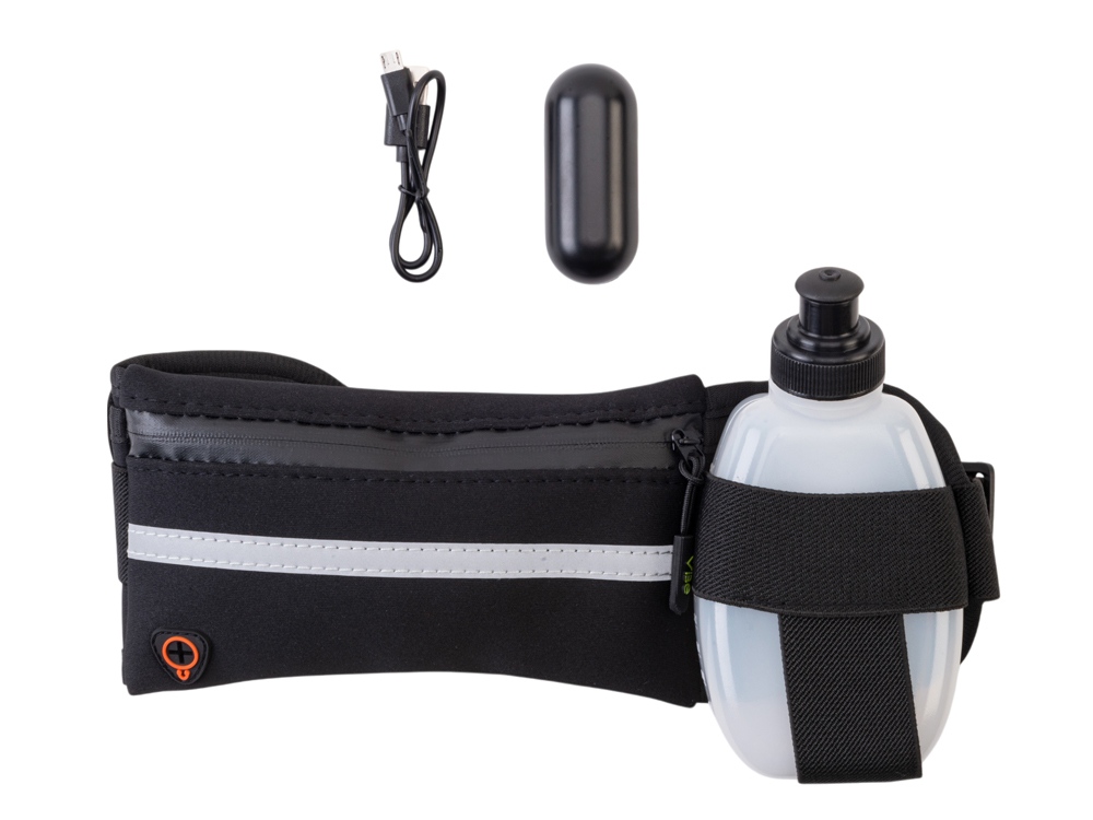 В комплекте — небольшая бутылочка с удобной поилкой, которая поможет вам перевести дух во время спринта. Бутылочка крепится к сумке специальной резинкой.