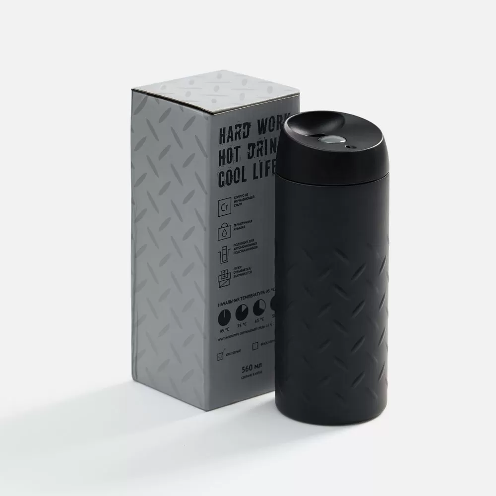Двухслойная вакуумная конструкция из нержавеющей стали. Герметичная завинчивающаяся крышка с нажимным клапаном для питья. Стакан подходит для большинства автомобильных подстаканников.