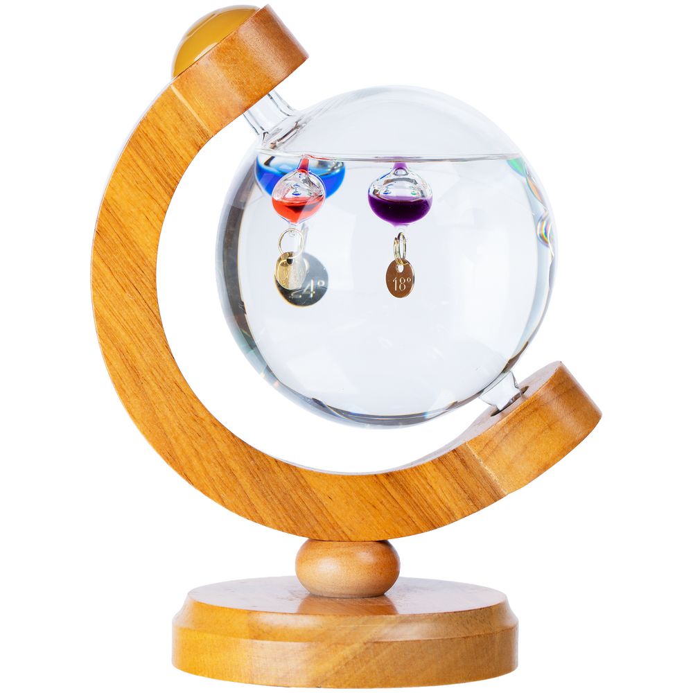 Термометр Галилео оригинальной формы, напоминающей глобус, добавит индивидуальности домашнему или офисному интерьеру. В основе его работы лежит физическая закономерность, впервые отмеченная великим Галилео Галилеем: плотность жидкости увеличивается при снижении температуры и уменьшается при ее повышении. И теперь стеклянные шарики в жидком парафине не только радуют глаз, но и позволяют с легкостью определить температуру в помещении.