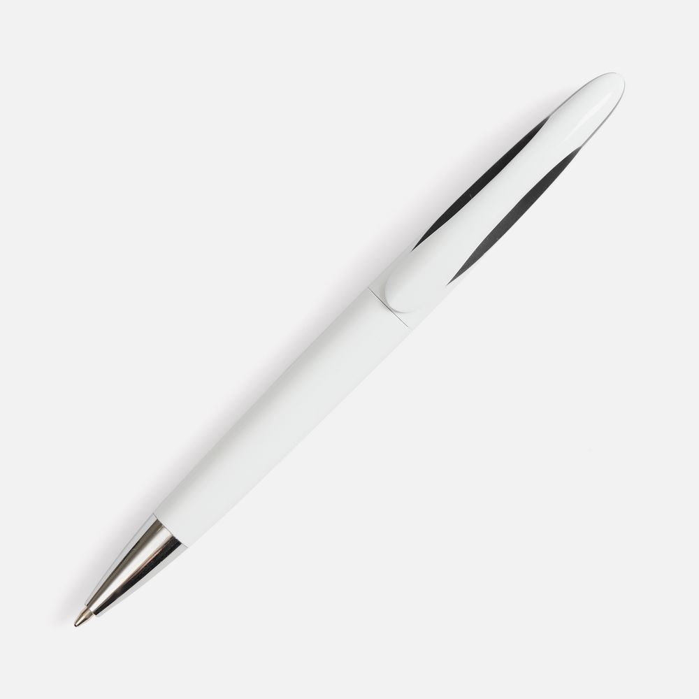 Шариковая ручка приятных округлых форм с белым глянцевым корпусом и цветовым акцентом.