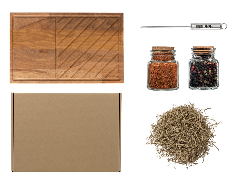 | Материал | коробка - картон, термометр - нержавеющая сталь, специи - стекло, пробковая крышка, доска - бук |