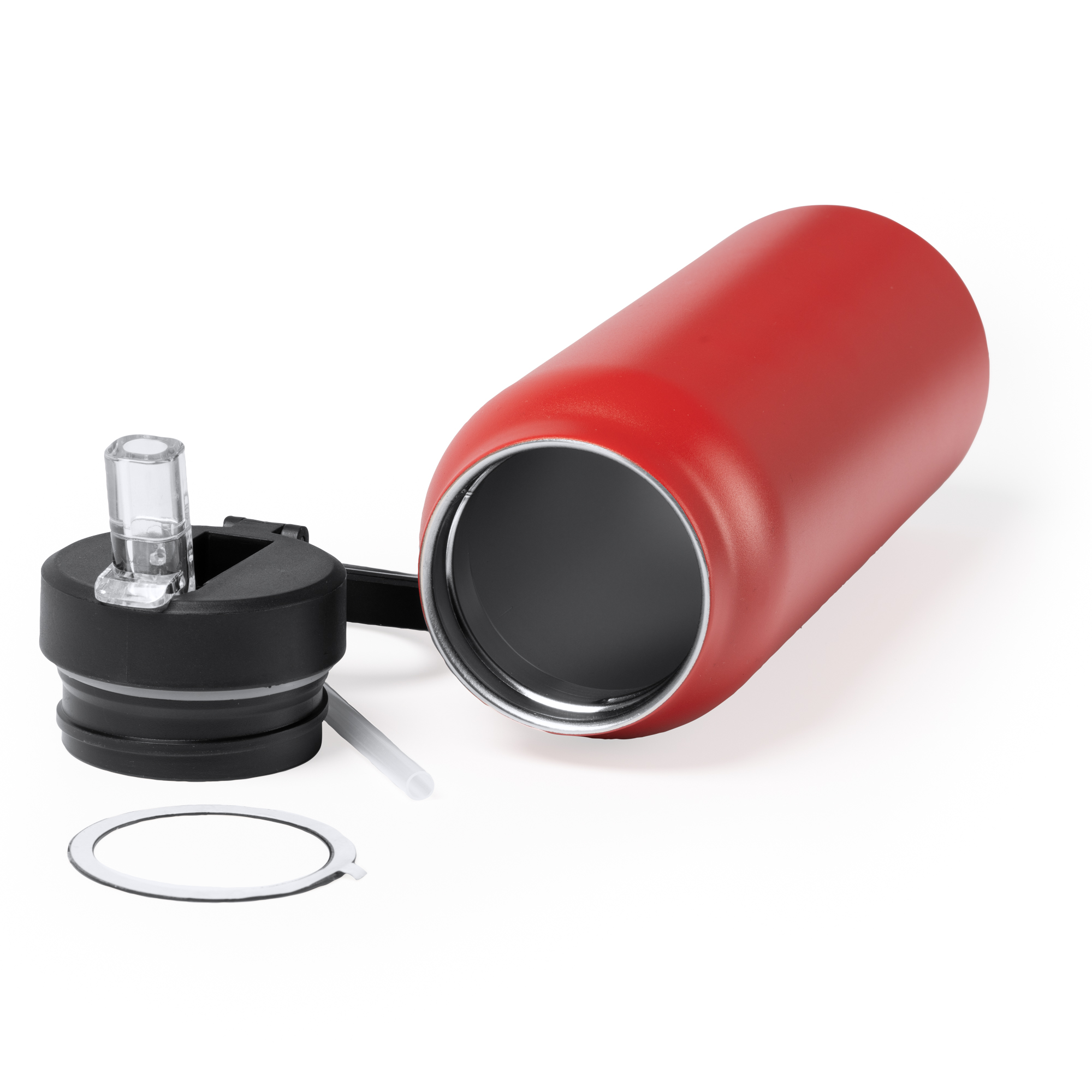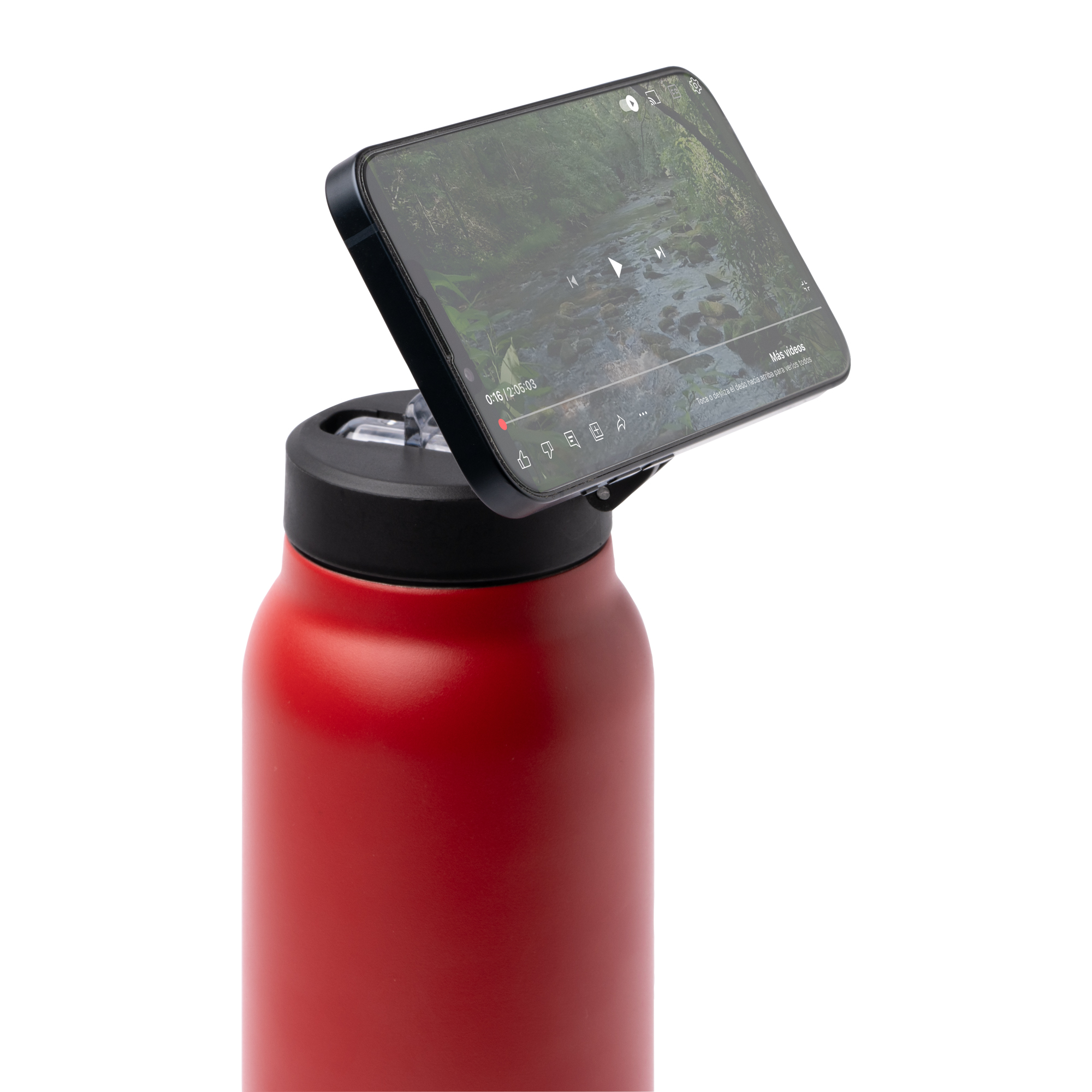 Бутылка-термос из переработанной нержавеющей стали с двойными стенками. Крышка с магнитным кольцом для держателя мобильного телефона. Со складной соломкой и нескользящей резиной на основании. Емкость: 750 мл.