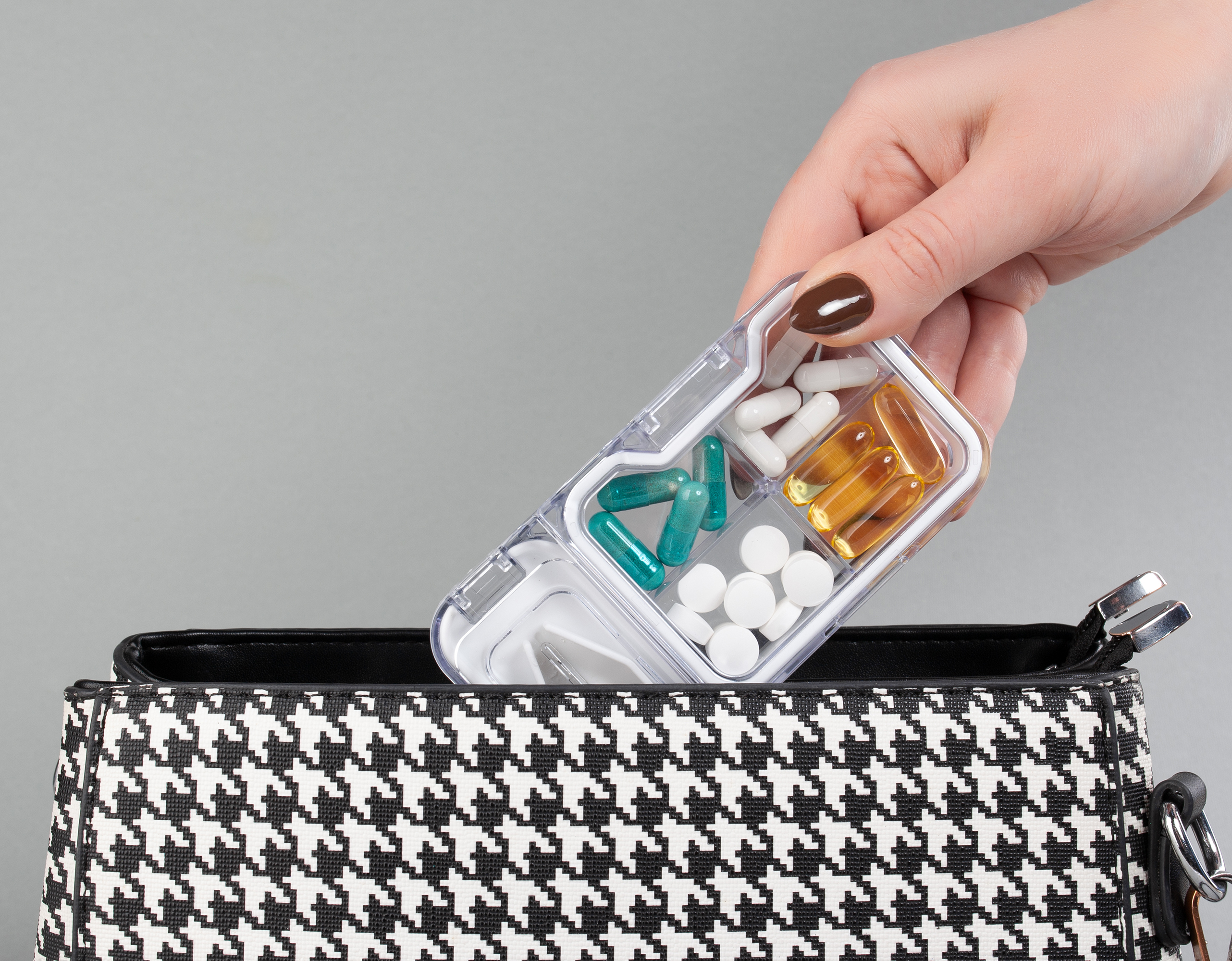 - Всегда иметь под рукой. Компактную таблетницу удобно брать с собой в дорогу, на работу или в путешествие. Она легко поместится в сумке или кармане.
