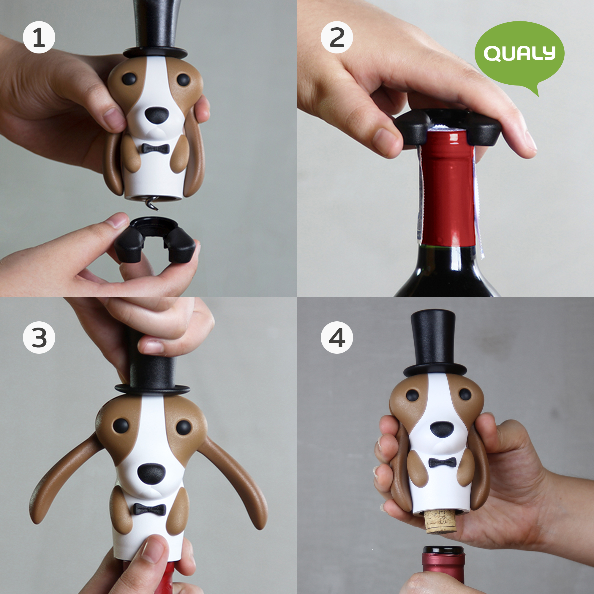 Штопор Wine Hound – это оригинальный презент для любителей хорошего вина. Удобная конструкция позволяет без труда изъять пробку из бутылки, превратив этот, как правило, сложный процесс в увлекательное развлечение. Ушки милого щенка используются в качестве рукояток, которые после вкручивания резьбы внутрь пробки необходимо плавно опустить вниз. Готово – наслаждайтесь ароматным вином в обществе родных и близких. Материал: ABS-пластик Размер штопора и резака для фольги : 63 x 69,6 x 145,5 мм.