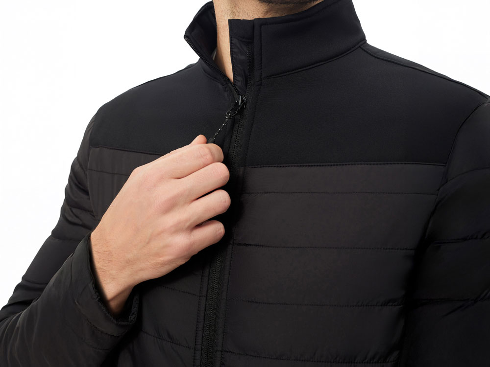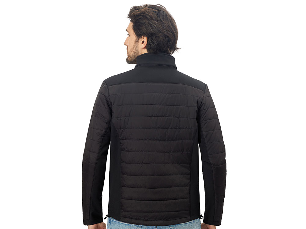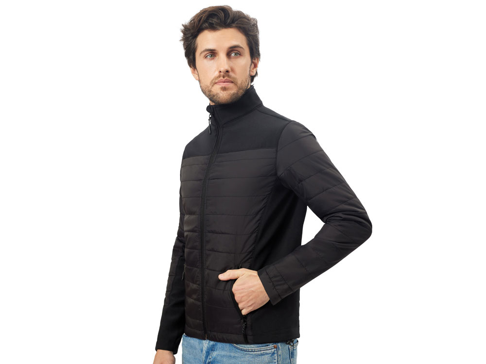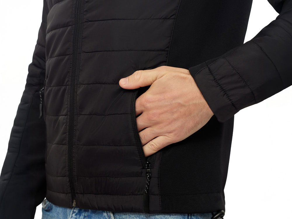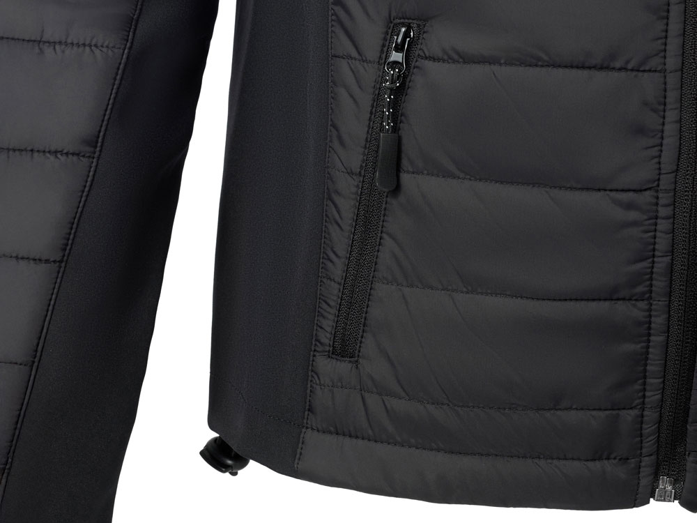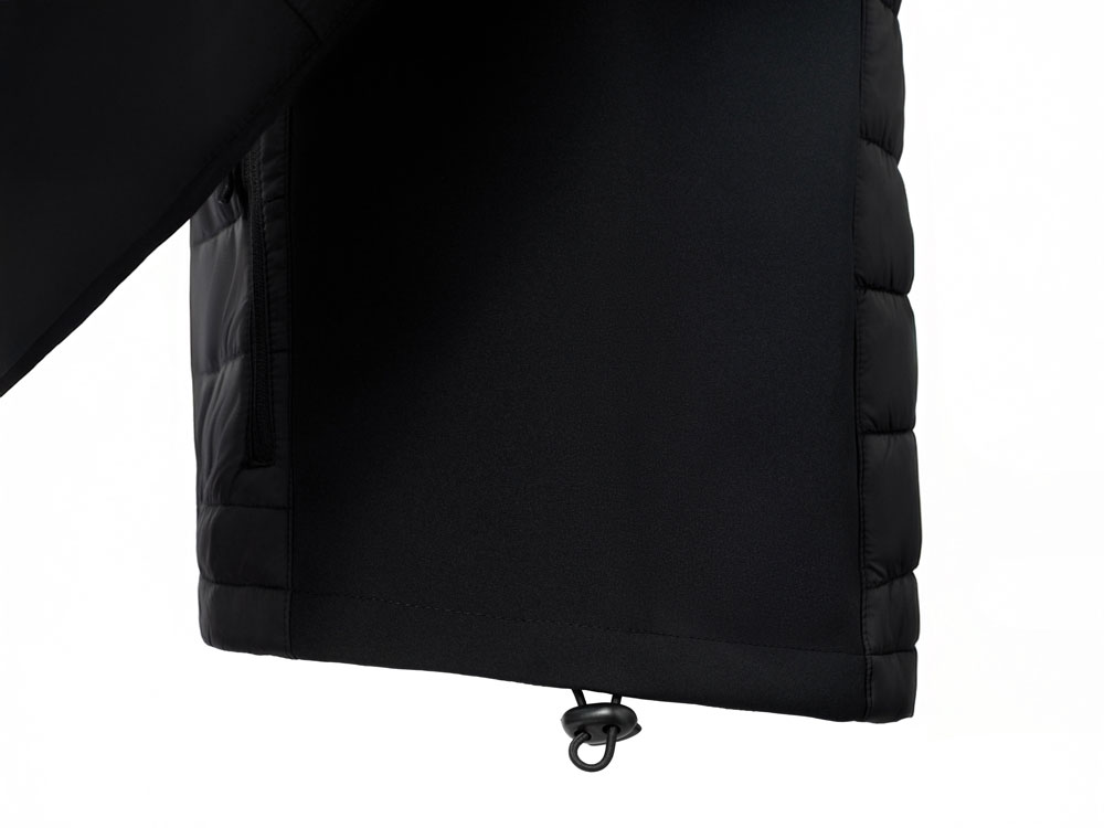 - гибридная конструкция из 2 видов материалов – софтшелл гарантирует ветронепроницаемость и легкость, а стеганные вставки добавляют утепления.