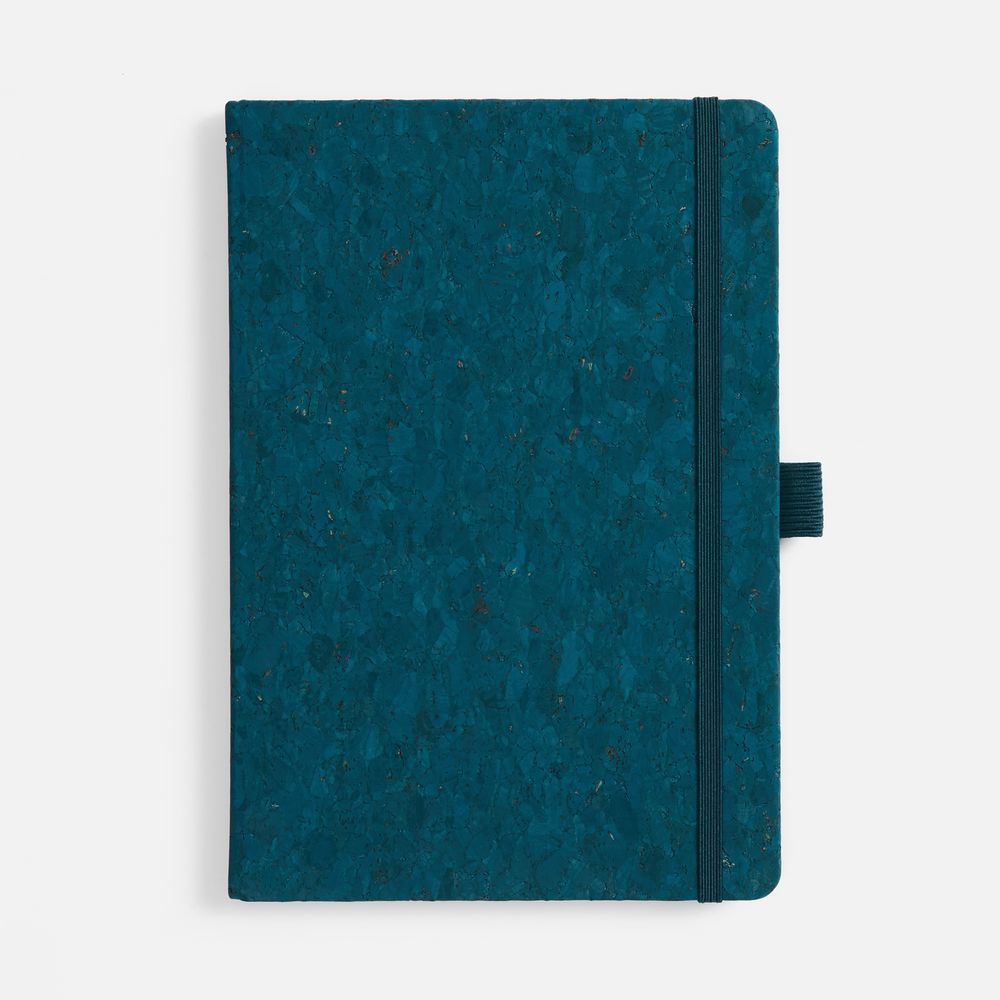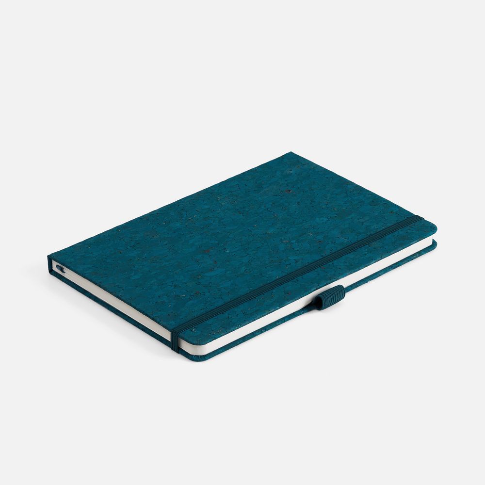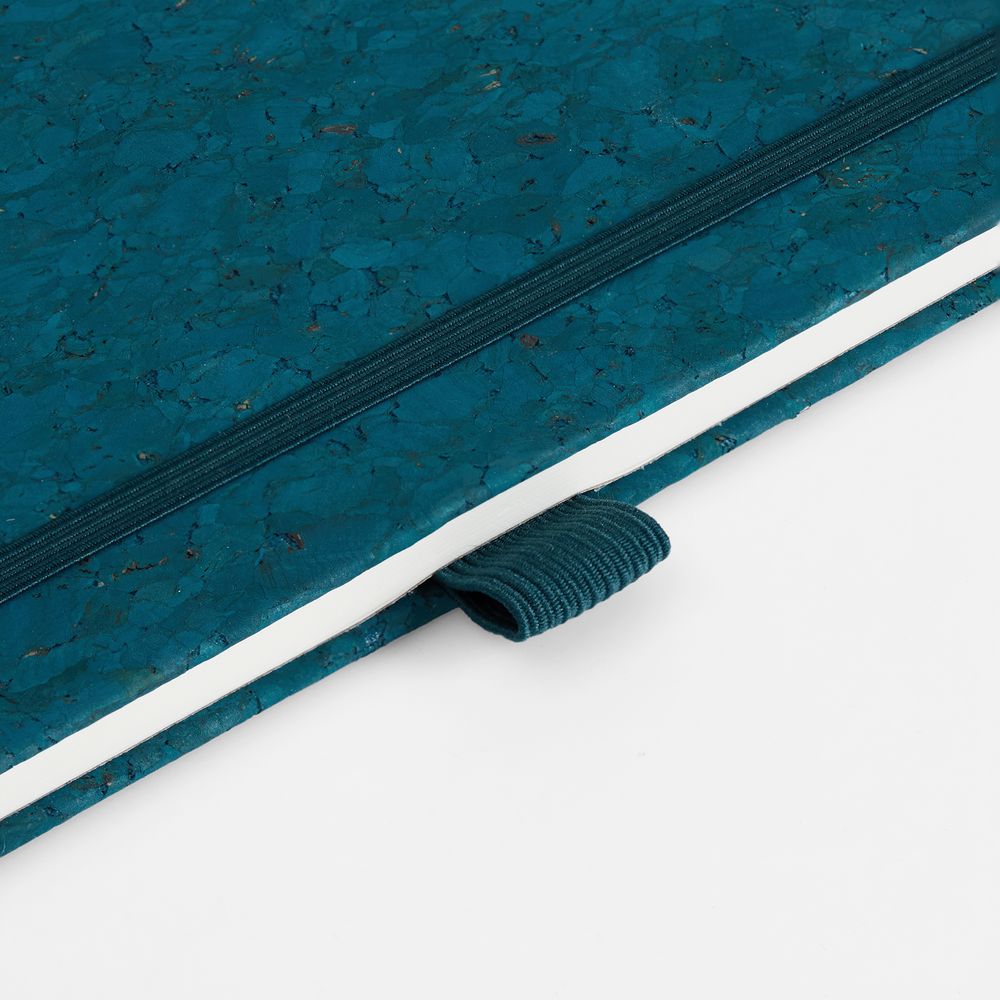 Блокнот с твердой обложкой из натуральной окрашенной пробки, дополнен петлей-резинкой для ручки, ляссе и резинкой в цвет обложки.