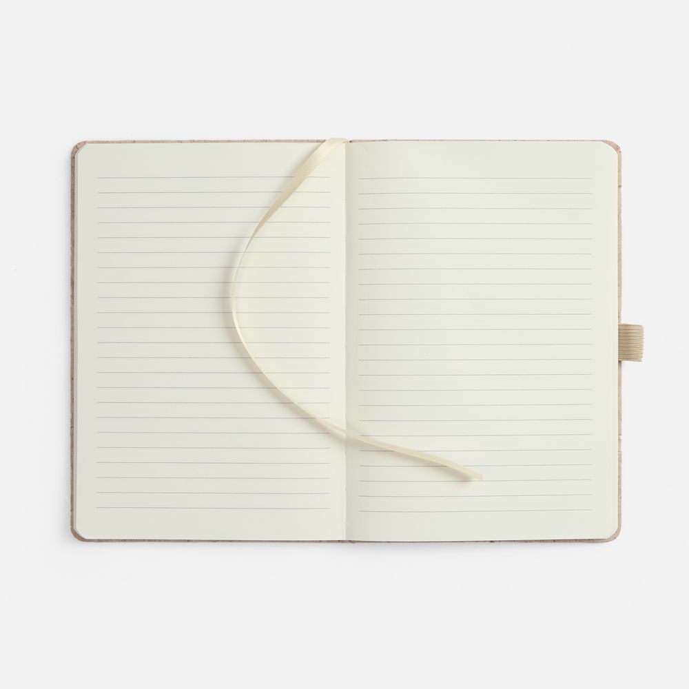 Блокнот с твердой обложкой из натуральной окрашенной пробки, дополнен петлей-резинкой для ручки, ляссе и резинкой в цвет обложки.
