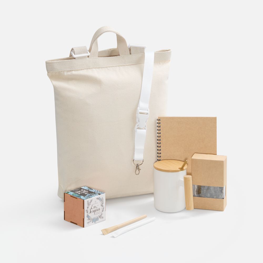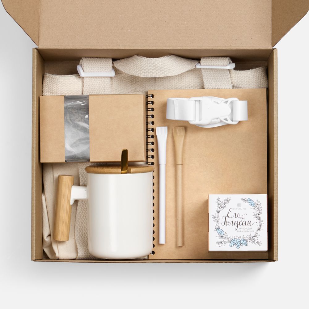 | Материал | рюкзак - хлопок, плотность 280 г/м²; кружка - керамика, ручка - бамбук; ложка - нержавеющая сталь; Набор для выращивания - дерево; блокнот, ручка - картон; коробка - микрогофрокартон, Т-23Е; лента - нейлон, пластик; металл |