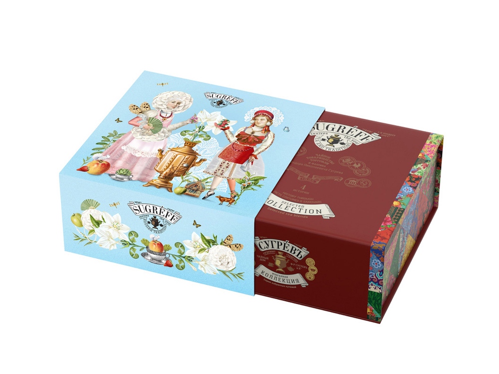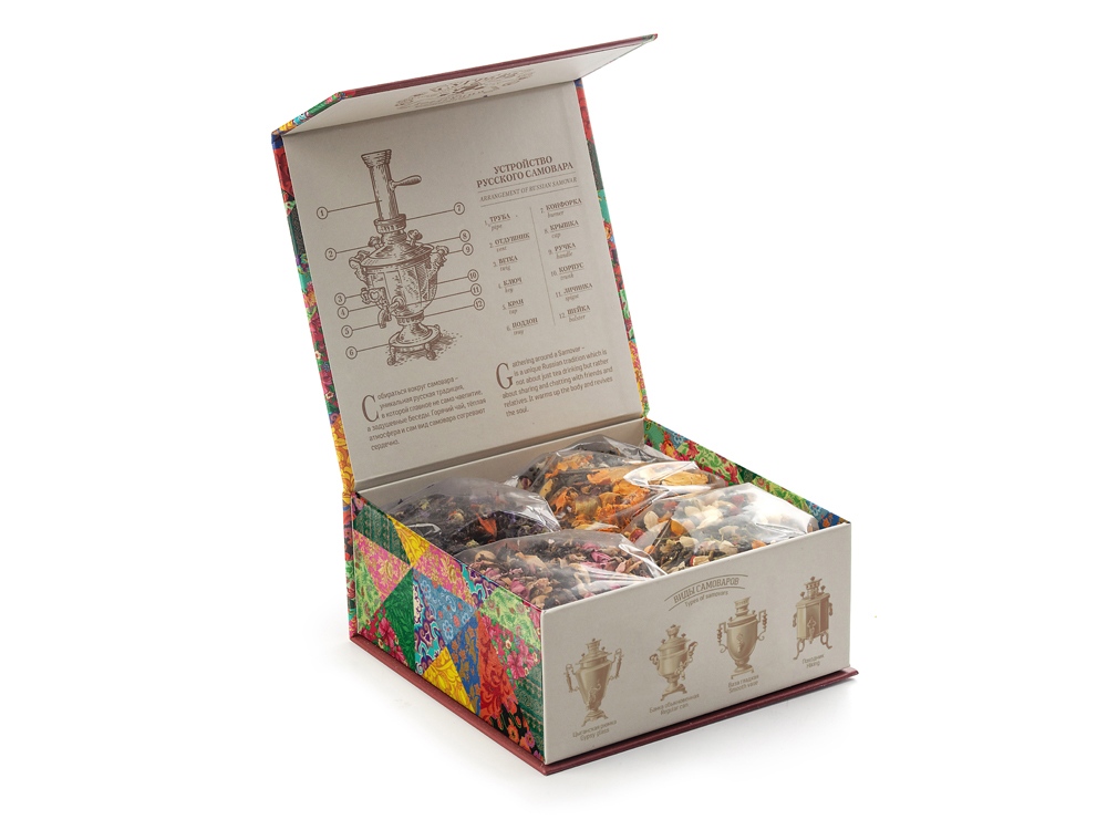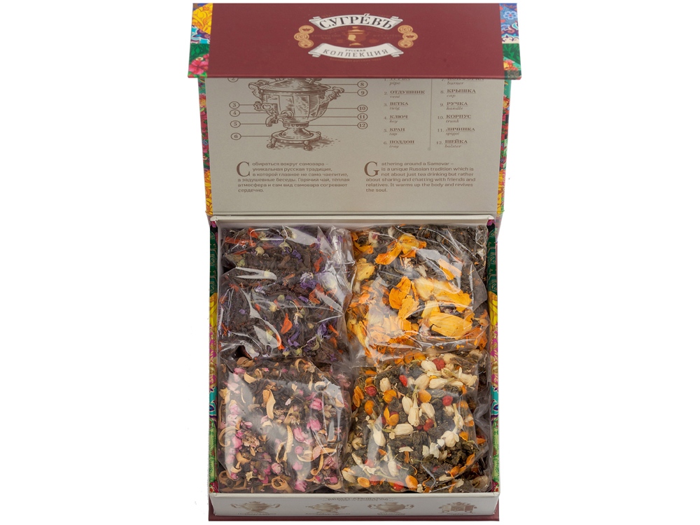Купажи чая составлены так, чтобы сочетать вкус и аромат отборных сортов китайского и индийского чай с красотой разноцветных лепестков календулы, мальвы, цветов яблони, жасмина, акации и других. Внутри шкатулки находится мини-открытка, которую покупатель может подписать.