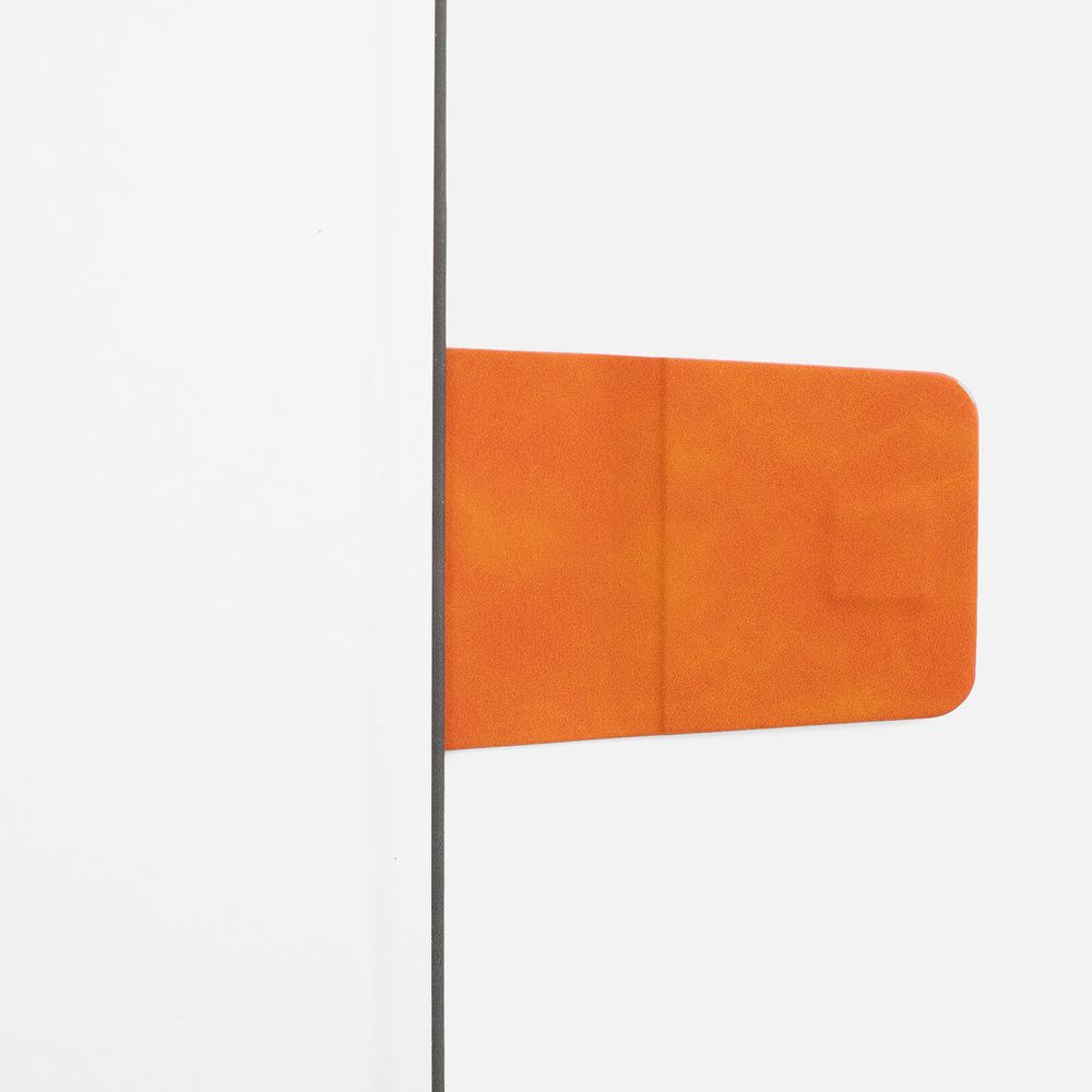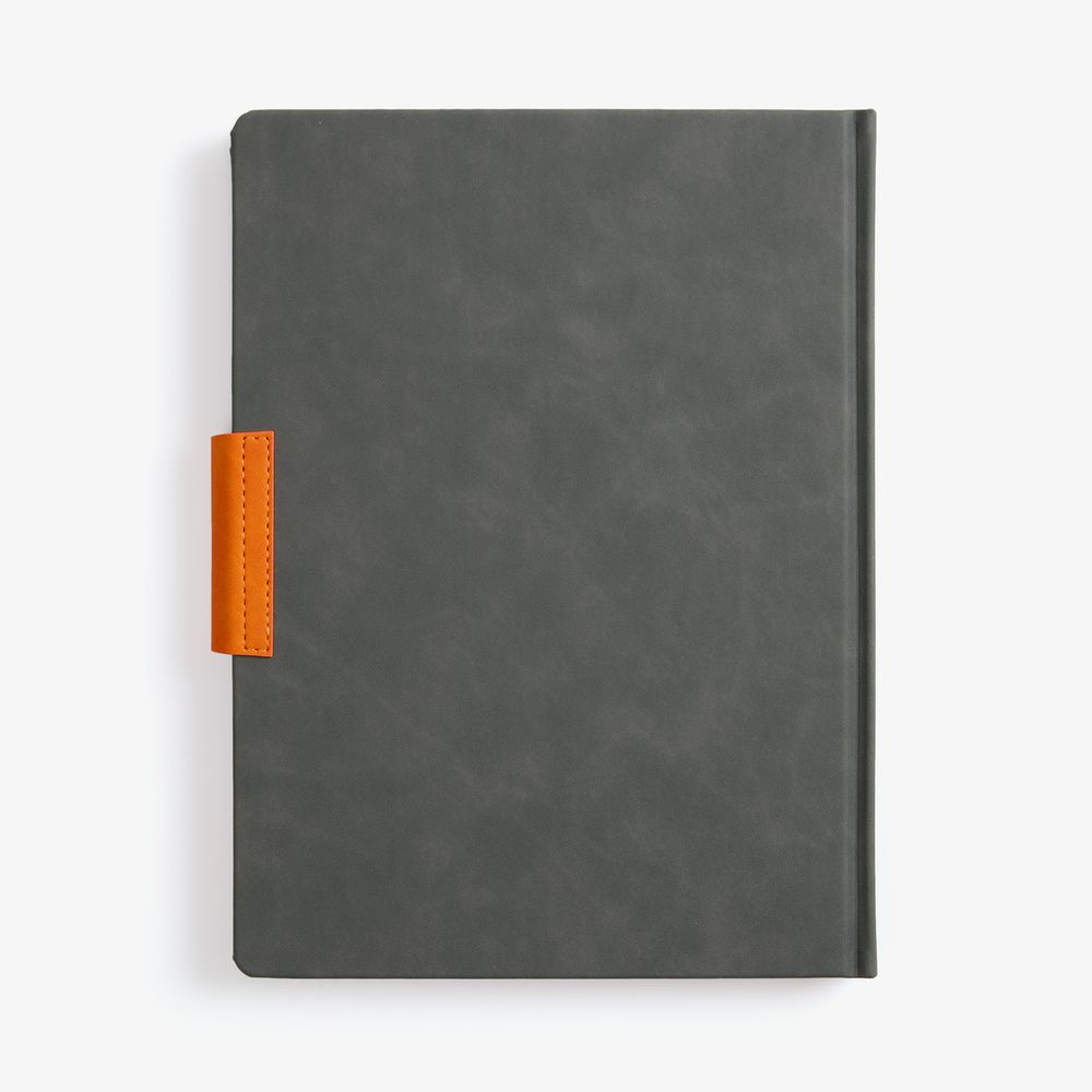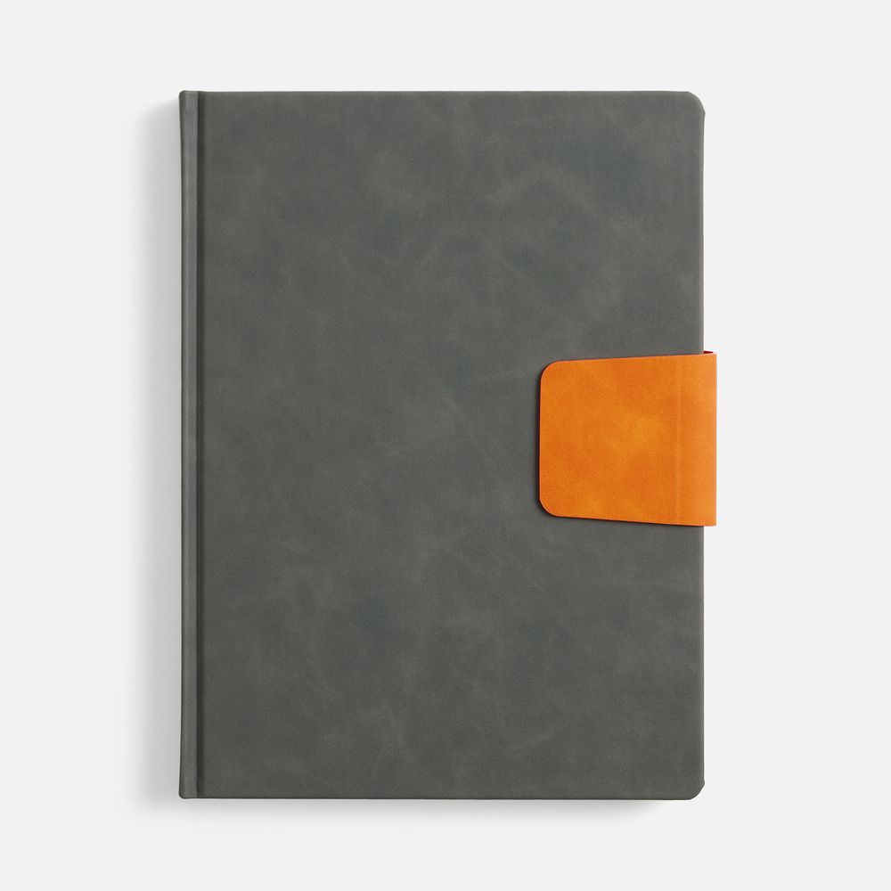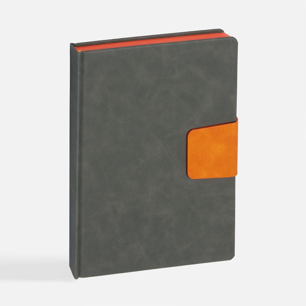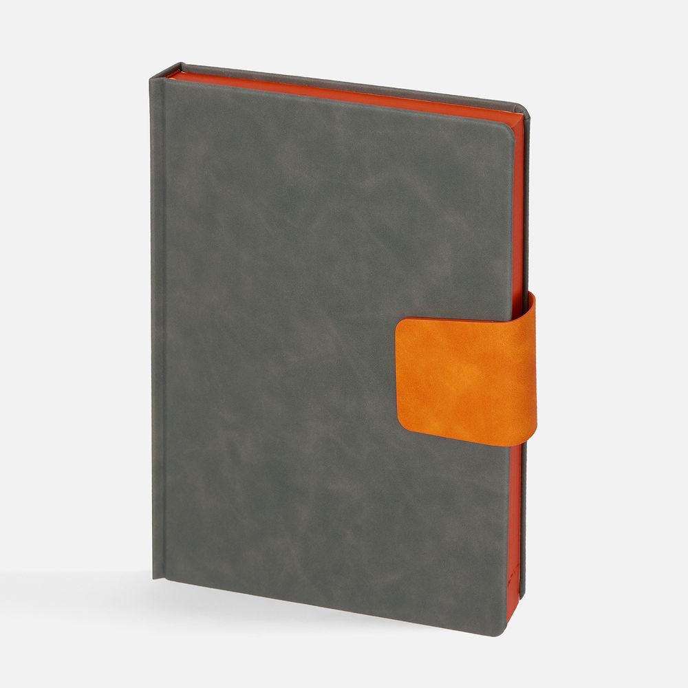 Ежедневник с твердой обложкой, выполнен из материала Nubuck Touch, серый СС, дополнен капталом, ляссе и обрезом оранжевого цвета. Застежка — хлястик на магните из материала Nubuck Touch Ultra, оранжевый ОО.