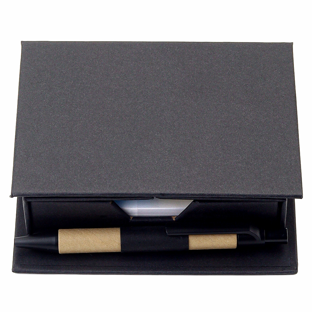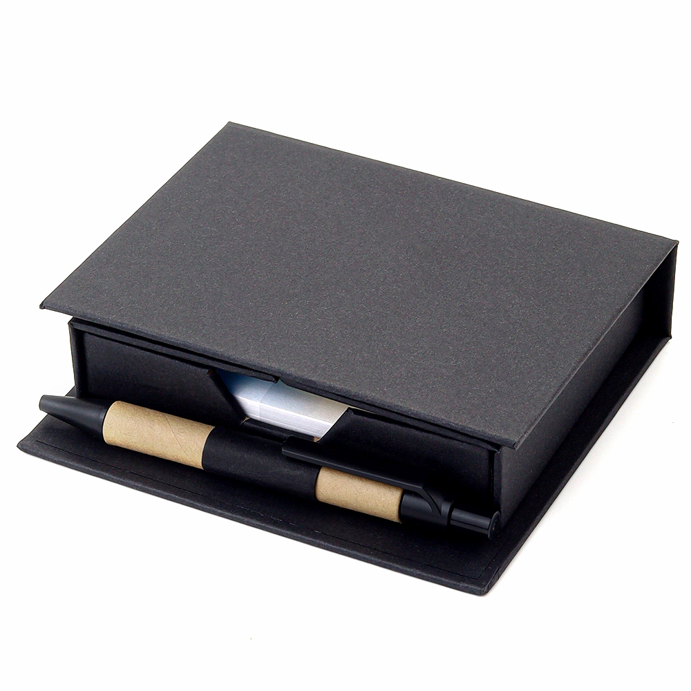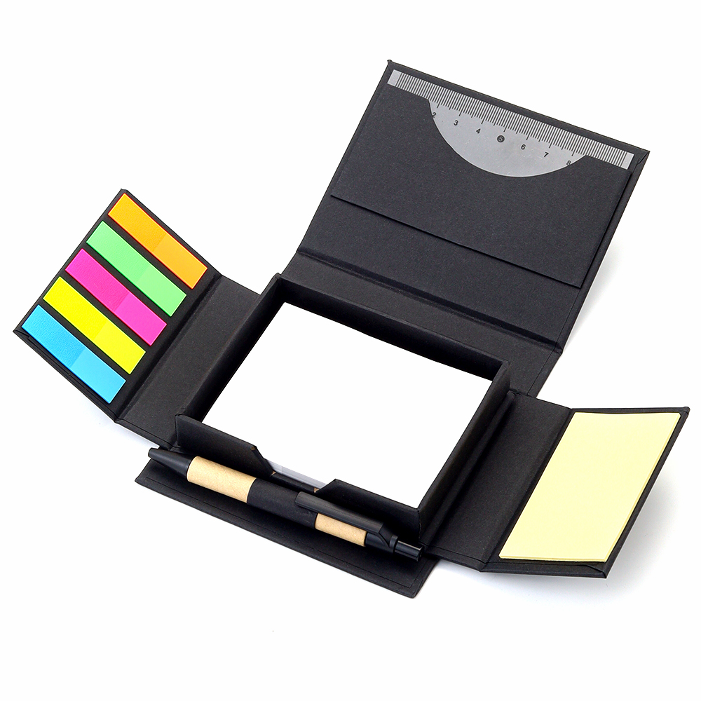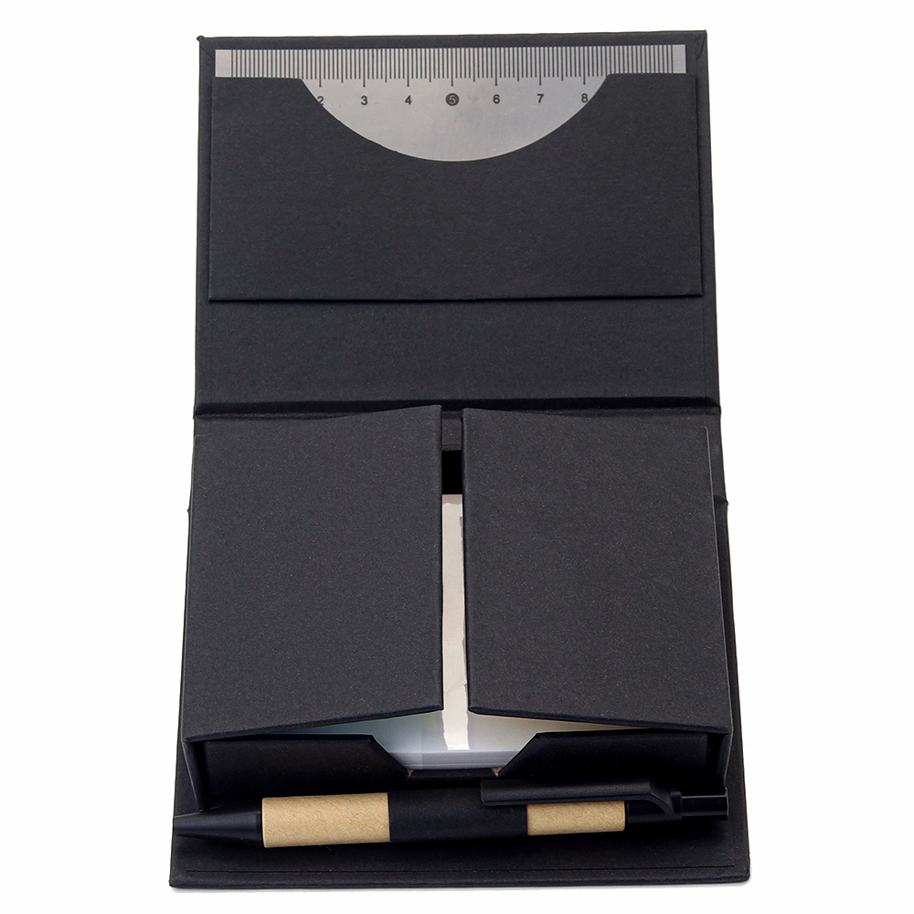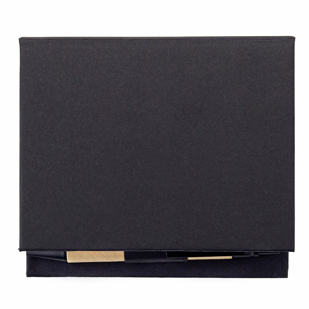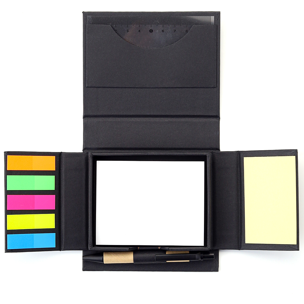В компактном футляре из переработанного черного картона вы найдете разноцветные стикеры, бумагу для заметок, линейку и ручку — всё необходимое для удобного планирования и творчества в одном наборе.