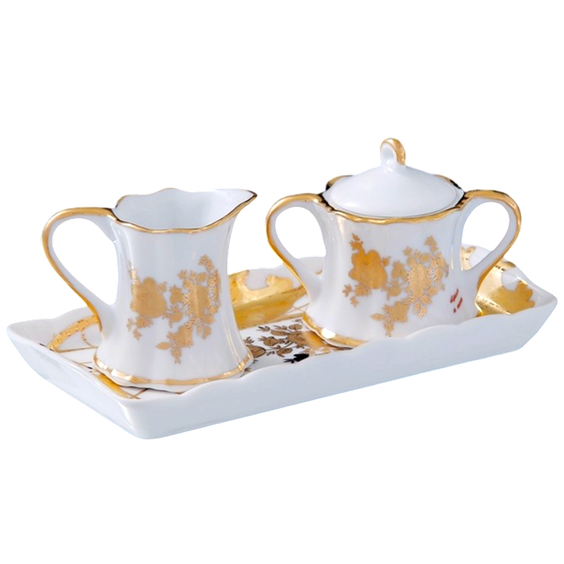 Набор "Мелисса" включает элегантный молочник, сахарницу и блюдце, выполненные из высококачественной керамики или фарфора. Изделия украшены нежным и изысканным дизайном с мотивами мелиссы или растительных орнаментов, что создает атмосферу уюта и гармонии. Молочник идеально подходит для подачи молока или сливок к кофе и чаю, а сахарница — для хранения сахара или сладостей. Блюдце служит удобной подставкой для сахарницы или для сервировки десертов. Этот набор станет прекрасным дополнением к сервировке стола .