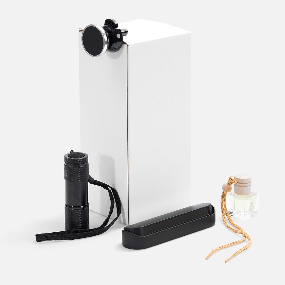 | Материал | держатель - АБС-пластик; визитка - пластик; фонарик - алюминий; ароматизатор - стекло, дерево; коробка - микрогофрокартон |