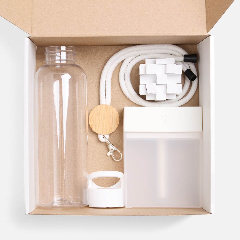 Набор собран с заботой: помимо надежного шнурка для бейджа — для быстрой идентификации на новом месте, здесь есть полезные аксессуары для гидратации как внешней, так и внутренней: компактный увлажнитель воздуха и стильная бутылка для воды. А дополняет эти функциональные предметы игра-головоломка, которая поможет и развить пространственное мышление, и переключить внимание — а в первые рабочие дни разгружать голову просто необходимо!