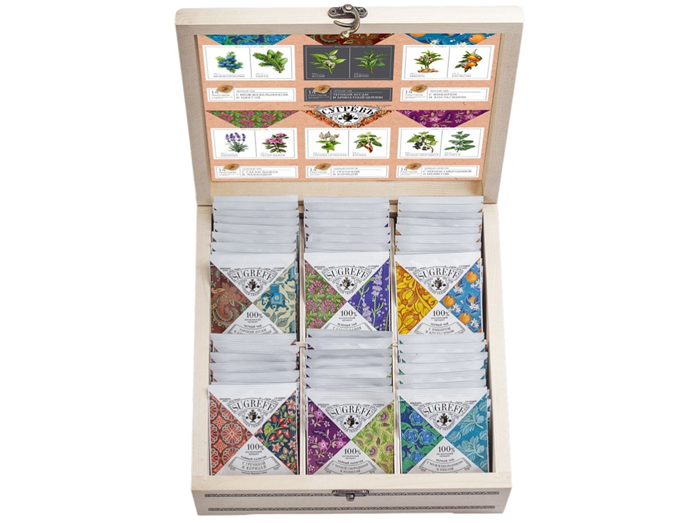 Набор многофункционален. Шкатулка с пакетиками будет эффектным и функциональным украшением вашей кухни или гостиной. В качестве чайного мини-дисплея она удобна для использования в офисе. Кроме того, набор является прекрасным подарком.