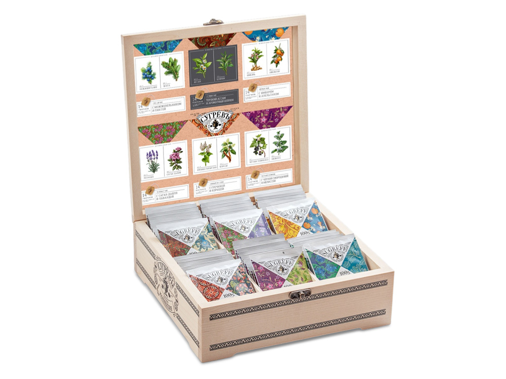 Набор представляет собой коллекцию из 6-и оригинальных купажей чая и чайных напитков в индивидуальных саше. В отличие от обычных пакетированных чаёв, наша продукция 100% натуральная. Яркие ароматы создаются благодаря естественному букету таких растений, как имбирь, апельсин, лаванда, пихта, можжевельник, чёрная смородина, мелисса и саган дайля.