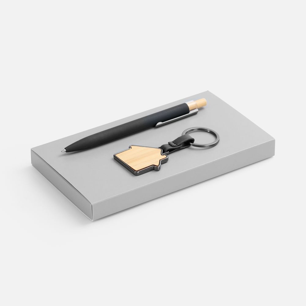 | Материал | брелок - металл; бамбук; ручка - металл, алюминий, кнопка - бамбук; коробка - картон |