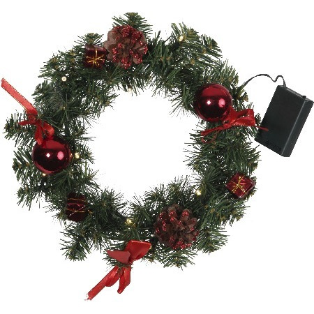 Венок еловый DECORAGE, диаметр 30 см, 10 LED ламп, на батарейках, зелёная хвоя, красные украшения 60
